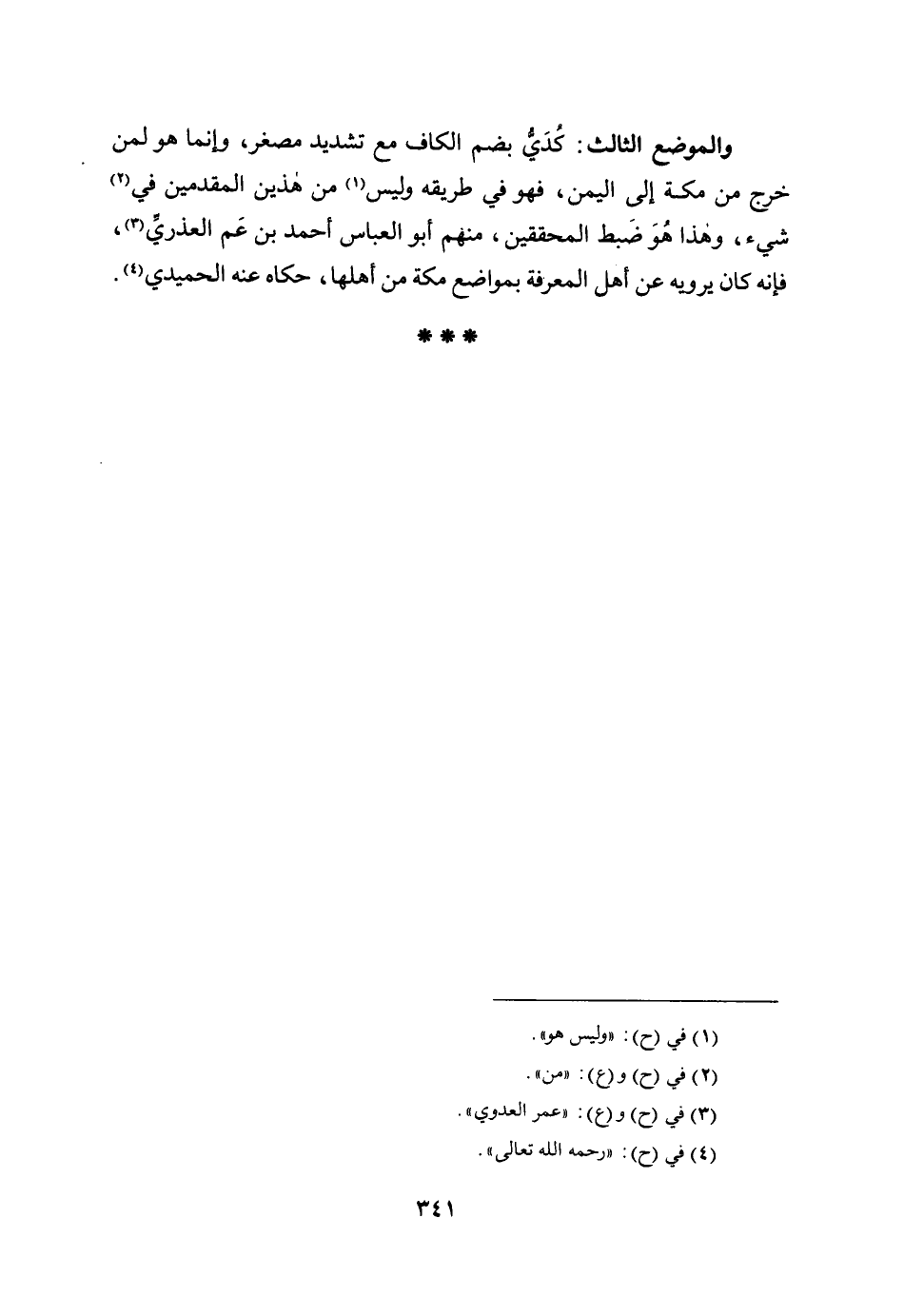 وَالْمَوْضِعُ الثَّالِثُ: كُدَيٌّ بِضَمِّ الْكَافِ مَعَ تَشْدِيدِ مصغر، وَإِنَّمَا هُوَ لِمَنْ خَرَجَ مِنْ مَكَّةَ إِلَى الْيَمَنِ، فَهُوَ فِي طَرِيقِهِ وَلَيْسَ مِنْ هَذَيْنِ المقدمين في شيء، وهذا هو ضَبْطُ الْمُحَقِقِّينَ، مِنْهُمْ أَبُو الْعَبَّاسِ أَحْمَدُ بْنُ عم الْعُذْرِيُّ، فَإِنَّهُ كَانَ يَرْوِيهِ عَنْ أَهْلِ الْمَعْرِفَةِ بِمَوَاضِعِ مَكَّةَ مِنْ أَهْلِهَا، حَكَاهُ عَنْهُ الْحُمَيْدِيُّ.