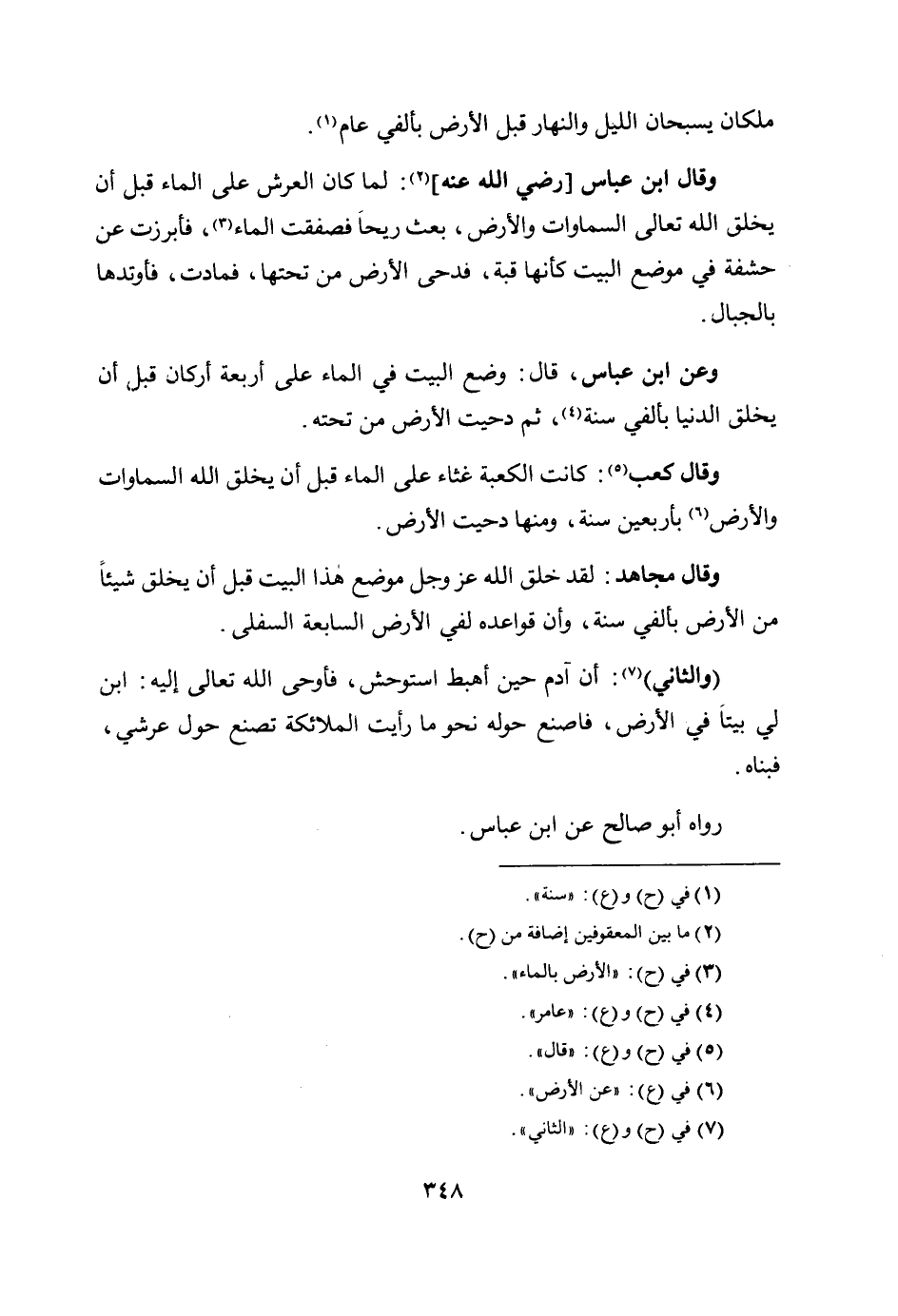 وعن ابن عباس: قَالَ: وُضِعَ الْبَيْتُ فِي الْمَاءِ عَلَى أَرْبَعَةِ أَرْكَانٍ قَبْلَ أَنْ يَخْلُقَ الدُّنْيَا بِأَلْفَيْ سَنَةٍ، ثُمَّ دُحِيَتِ الأَرْضُ مِنْ تَحْتِهِ.