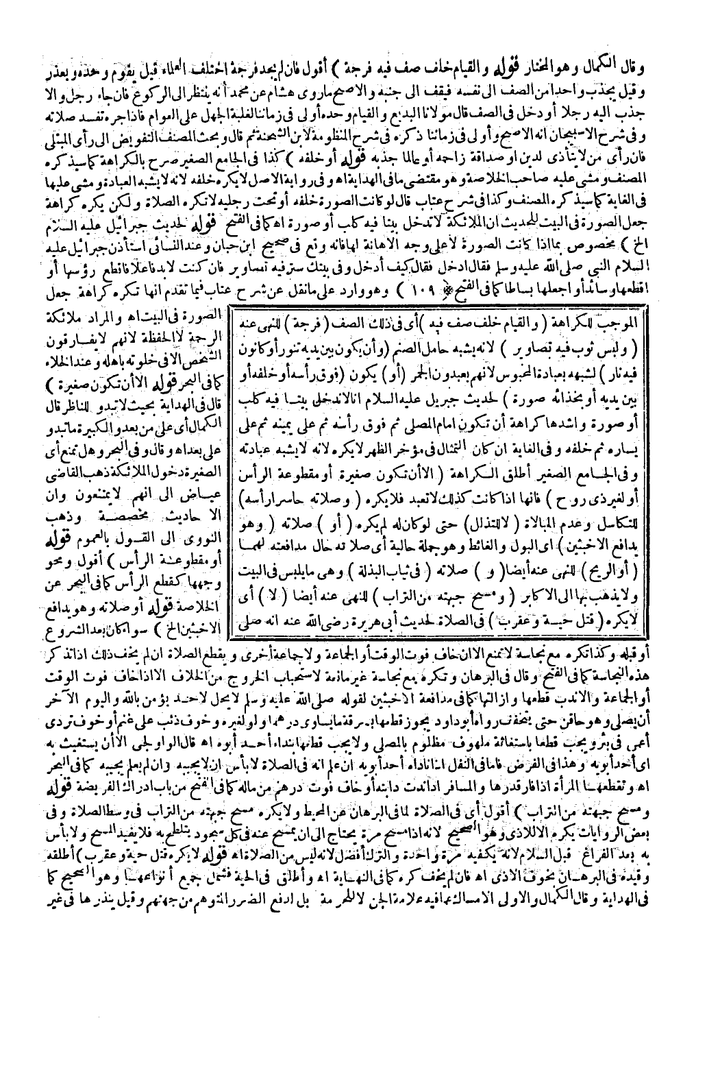 الْمُوجِبِ لِلْكَرَاهَةِ (وَالْقِيَامُ خَلْفَ صَفٍّ فِيهِ) أَيْ فِي ذَلِكَ الصَّفِّ (فُرْجَةٌ) لِلنَّهْيِ عَنْهُ (وَلُبْسُ ثَوْبٍ فِيهِ تَصَاوِيرُ) ؛ لِأَنَّهُ يُشْبِهُ حَامِلَ الصَّنَمِ (وَأَنْ يَكُونَ بَيْنَ يَدَيْهِ تَنُّورٌ أَوْ كَانُونٌ فِيهِ نَارٌ) لِشَبَهِهِ بِعِبَادَةِ الْمَجُوسِ؛ لِأَنَّهُمْ يَعْبُدُونَ الْجَمْرَ (أَوْ) يَكُونَ (فَوْقَ رَأْسِهِ أَوْ خَلْفَهُ أَوْ بَيْنَ يَدَيْهِ أَوْ بِحِذَائِهِ صُورَةٌ) لِحَدِيثِ جِبْرِيلَ - عَلَيْهِ السَّلَامُ - «إنَّا لَا نَدْخُلُ بَيْتًا فِيهِ كَلْبٌ أَوْ صُورَةٌ» وَأَشَدُّهَا كَرَاهَةً أَنْ تَكُونَ أَمَامَ الْمُصَلِّي ثُمَّ فَوْقَ رَأْسِهِ ثُمَّ عَلَى يَمِينِهِ ثُمَّ عَلَى يَسَارِهِ ثُمَّ خَلْفَهُ.