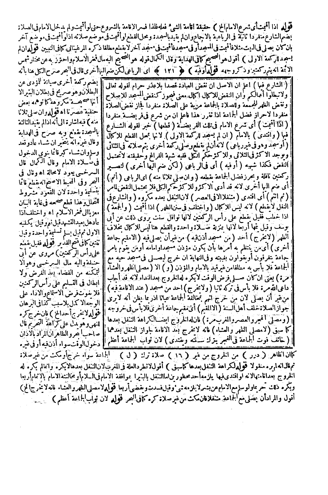 (الشَّارِعِ فِيهَا) اعْلَمْ أَنَّ الْأَصْلَ أَنَّ نَقْضَ الْعِبَادَةِ قَصْدًا بِلَا عُذْرٍ حَرَامٌ لِقَوْلِهِ تَعَالَى {وَلا تُبْطِلُوا أَعْمَالَكُمْ} [محمد: 33] وَأَنَّ النَّقْضَ لِلْإِكْمَالِ إكْمَالٌ مَعْنًى فَيَجُوزُ كَنَقْضِ الْمَسْجِدِ لِلْإِصْلَاحِ وَنَقْضِ الظُّهْرِ لِلْجُمُعَةِ وَلِلصَّلَاةِ بِالْجَمَاعَةِ مَزِيَّةٌ عَلَى الصَّلَاةِ مُنْفَرِدًا فَجَازَ نَقْضُ الصَّلَاةِ مُنْفَرِدًا لِإِحْرَازِ فَضْلِ الْجَمَاعَةِ إذَا تَقَرَّرَ هَذَا فَاعْلَمْ أَنَّ مَنْ شَرَعَ فِي فَرِيضَةٍ مُنْفَرِدًا (إذَا أُقِيمَتْ) أَيْ شَرَعَ الْإِمَامُ فِي تِلْكَ الْفَرِيضَةِ (قَطَعَهَا) خَبَرٌ لِقَوْلِهِ الشَّارِعِ فِيهَا (وَاقْتَدَى) بِالْإِمَامِ (إنْ لَمْ يَسْجُدْ لِلرَّكْعَةِ الْأُولَى) ؛ لِأَنَّهَا بِمَحَلِّ الْقَطْعِ لِلْإِكْمَالِ (أَوْ سَجَدَ وَهُوَ فِي غَيْرِ رُبَاعِيٍّ) ؛ لِأَنَّهُ إنْ لَمْ يَقْطَعْ وَصَلَّى رَكْعَةً أُخْرَى يُتِمُّ صَلَاتَهُ فِي الثُّنَائِيِّ وَيُوجَدُ الْأَكْثَرُ فِي الثُّلَاثِيِّ وَلِلْأَكْثَرِ حُكْمُ الْكُلِّ فَفِيهِ شُبْهَةُ الْفَرَاغِ وَحَقِيقَتُهُ لَا تَحْتَمِلُ النَّقْضَ فَكَذَا شُبْهَتُهُ (أَوْ فِيهِ) أَيْ فِي الرُّبَاعِيِّ (لَكِنْ ضُمَّ إلَيْهَا أُخْرَى) لِتَصِيرَ رَكْعَتَيْنِ نَافِلَةً وَيُحْرِزُ فَضْلَ الْجَمَاعَةِ بِقَطْعِهِ (وَإِنْ صَلَّى ثَلَاثًا مِنْهُ) أَيْ الرُّبَاعِيِّ (أَتَمَّ) أَيْ ضَمَّ إلَيْهَا أُخْرَى؛ لِأَنَّهُ قَدْ أَدَّى الْأَكْثَرَ وَلِلْأَكْثَرِ حُكْمُ الْكُلِّ فَلَا يَحْتَمِلُ النَّقْصَ لِمَا مَرَّ (ثُمَّ أَتَمَّ) أَيْ اقْتَدَى مُتَنَفِّلًا (إلَّا فِي الْعَصْرِ) ؛ لِأَنَّ التَّنَفُّلَ بَعْدَهُ مَكْرُوهٌ (وَالشَّارِعُ فِي النَّفْلِ لَا يَقْطَعُ) ؛ لِأَنَّهُ لَيْسَ لِلْإِكْمَالِ.