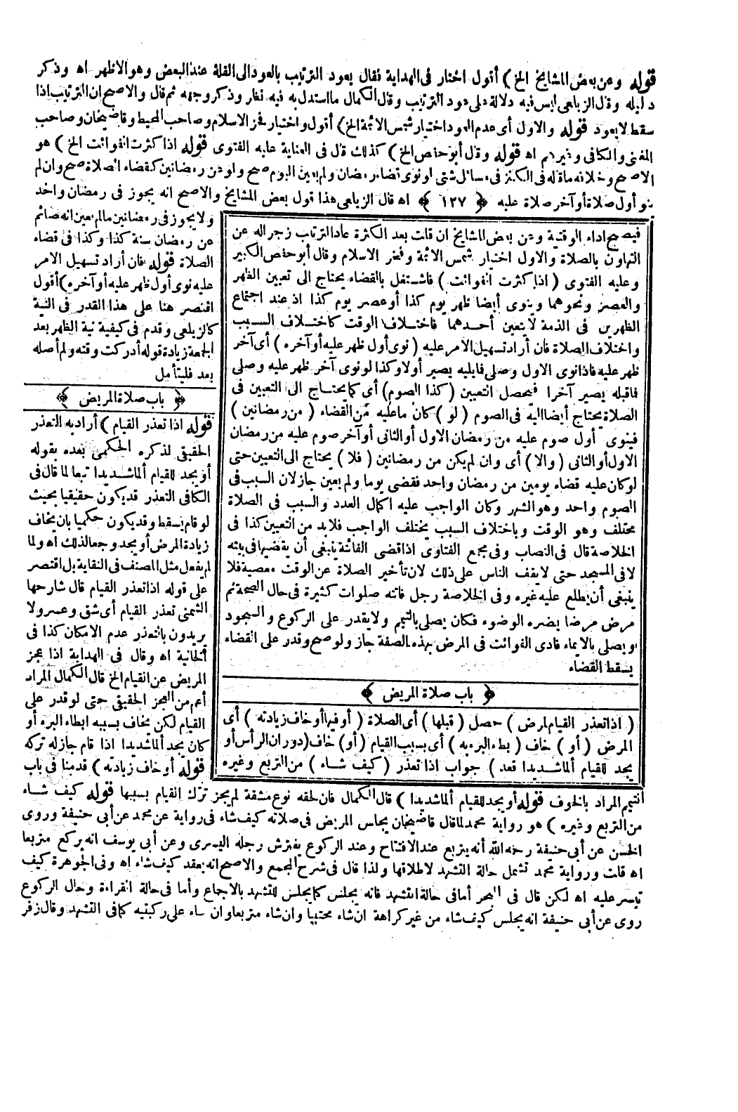 وَقَالَ فِي الْهِدَايَةِ إذَا عَجَزَ الْمَرِيضُ عَنْ الْقِيَامِ. . . إلَخْ قَالَ الْكَمَالُ الْمُرَادُ أَعَمُّ مِنْ الْعَجْزِ الْحَقِيقِيِّ حَتَّى لَوْ قَدَرَ عَلَى الْقِيَامِ لَكِنْ يَخَافُ بِسَبَبِهِ إبْطَاءَ الْبُرْءِ أَوْ كَأَنْ يَجِدَ أَلَمًا شَدِيدًا إذَا قَامَ جَازَ لَهُ تَرْكُهُ.