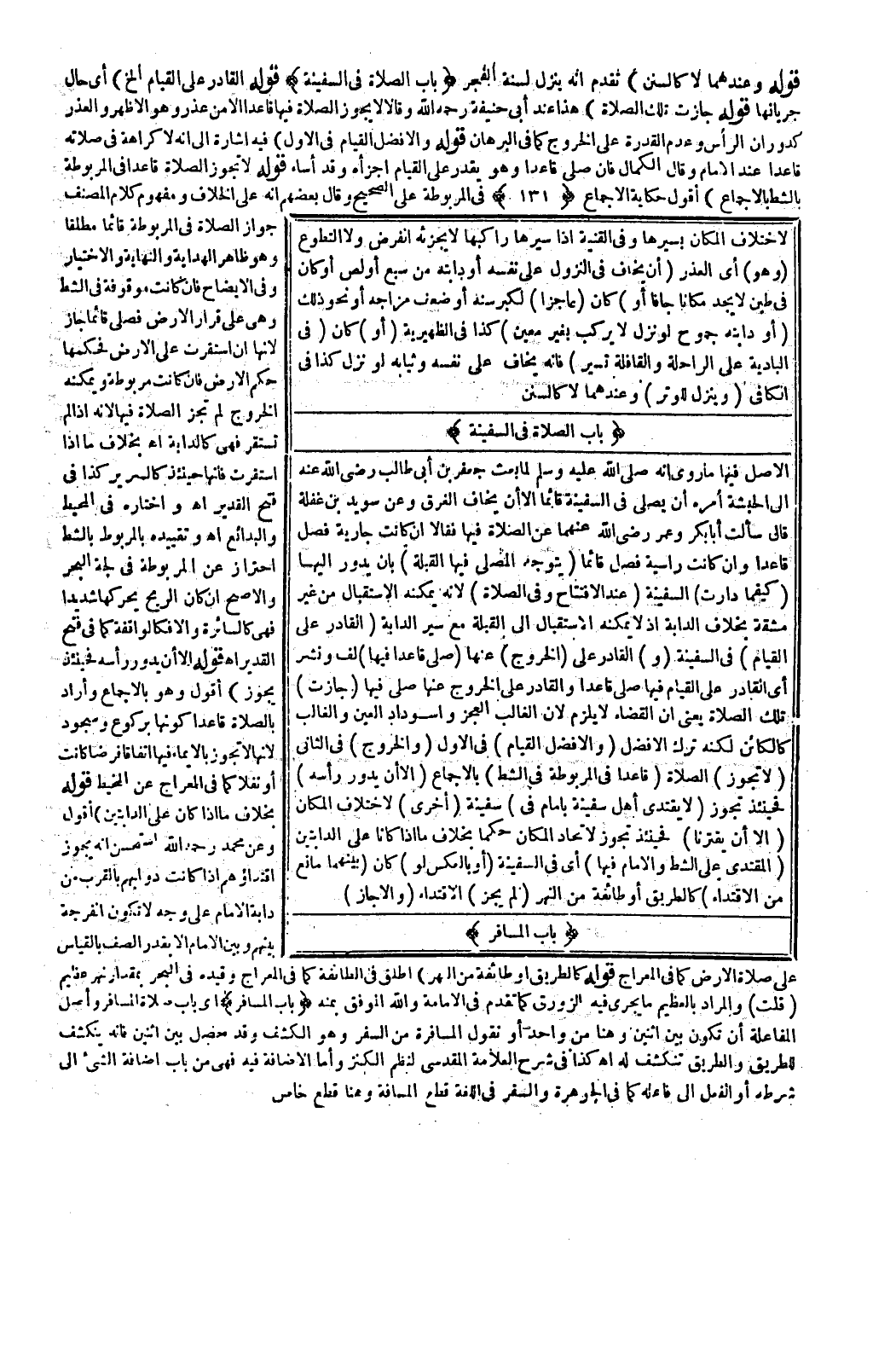 الْأَصْلُ فِيهَا مَا رُوِيَ «أَنَّهُ - صَلَّى اللَّهُ عَلَيْهِ وَسَلَّمَ - لَمَّا بَعَثَ جَعْفَرَ بْنَ أَبِي طَالِبٍ - رَضِيَ اللَّهُ عَنْهُ - إلَى الْحَبَشَةِ أَمَرَهُ أَنْ يُصَلِّيَ فِي السَّفِينَةِ قَائِمًا إلَّا أَنْ يَخَافَ الْغَرَقَ» وَعَنْ سُوَيْد بْنِ غَفَلَةَ قَالَ سَأَلْت أَبَا بَكْرٍ وَعُمَرَ - رَضِيَ اللَّهُ عَنْهُمَا - عَنْ الصَّلَاةِ فِيهَا فَقَالَ إنْ كَانَتْ جَارِيَةً فَصَلِّ قَاعِدًا، وَإِنْ كَانَتْ رَاسِيَةً فَصَلِّ قَائِمًا (يَتَوَجَّهُ الْمُصَلِّي فِيهَا الْقِبْلَةَ) بِأَنْ يَدُورَ إلَيْهَا (كَيْفَمَا دَارَتْ) السَّفِينَةُ (عِنْدَ الِافْتِتَاحِ وَفِي الصَّلَاةِ) ؛ لِأَنَّهُ يُمْكِنُهُ الِاسْتِقْبَالُ مِنْ غَيْرِ مَشَقَّةٍ بِخِلَافِ الدَّابَّةِ إذْ لَا يُمْكِنُهُ الِاسْتِقْبَالُ إلَى الْقِبْلَةِ مَعَ سَيْرِ الدَّابَّةِ (الْقَادِرُ عَلَى الْقِيَامِ) فِي السَّفِينَةِ (وَ) الْقَادِرُ عَلَى (الْخُرُوجِ) عَنْهَا (صَلَّى قَاعِدًا فِيهَا) لَفٌّ وَنَشْرٌ أَيْ الْقَادِرُ عَلَى الْقِيَامِ فِيهَا صَلَّى قَاعِدًا وَالْقَادِرُ عَلَى الْخُرُوجِ عَنْهَا صَلَّى فِيهَا (جَازَتْ) تِلْكَ الصَّلَاةُ يَعْنِي أَنَّ الْقَضَاءَ لَا يَلْزَمُ؛ لِأَنَّ الْغَالِبَ الْعَجْزُ وَاسْوِدَادُ الْعَيْنِ وَالْغَالِبُ كَالْكَائِنِ لَكِنَّهُ تَرَكَ الْأَفْضَلَ (وَالْأَفْضَلُ الْقِيَامُ) فِي الْأَوَّلِ (وَالْخُرُوجُ) فِي الثَّانِي (لَا تَجُوزُ) الصَّلَاةُ (قَاعِدًا فِي الْمَرْبُوطَةِ فِي الشَّطِّ) بِالْإِجْمَاعِ (إلَّا أَنْ يَدُورَ رَأْسُهُ) فَحِينَئِذٍ تَجُوزُ.