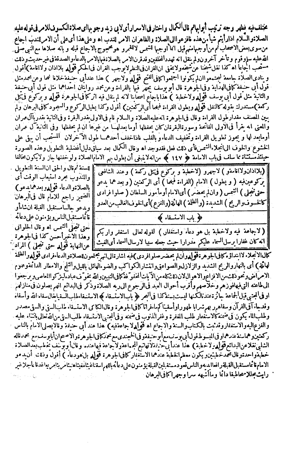 وَقَالَ فِي الْجَوْهَرَةِ «أَنَّهُ - عَلَيْهِ الصَّلَاةُ وَالسَّلَامُ - قَامَ فِي الْأُولَى بِقَدْرِ الْبَقَرَةِ وَفِي الثَّانِيَةِ بِقَدْرِ آلِ عِمْرَانَ» وَالْمَعْنَى أَنَّهُ يَقْرَأُ فِي الْأُولَى الْفَاتِحَةَ وَسُورَةَ الْبَقَرَةِ إنْ كَانَ يَحْفَظُهَا أَوْ مَا يَعْدِلُهَا مِنْ غَيْرِهَا إنْ لَمْ يَحْفَظْهَا فِي الثَّانِيَةِ آلَ عِمْرَانَ أَوْ مَا يَعْدِلُهَا وَيَجُوزُ تَطْوِيلُ الْقِرَاءَةِ وَتَخْفِيفُ الدُّعَاءِ وَبِالْقَلْبِ فَإِذَا خَفَّفَ أَحَدَهُمَا طَوَّلَ الْآخَرَ؛ لِأَنَّ الْمُسْتَحَبَّ أَنْ يُبْقِي عَلَى الْخُشُوعِ وَالْخَوْفِ إلَى انْجِلَاءِ الشَّمْسِ فَأَيُّ ذَلِكَ فَعَلَ فَقَدْ وُجِدَ اهـ.