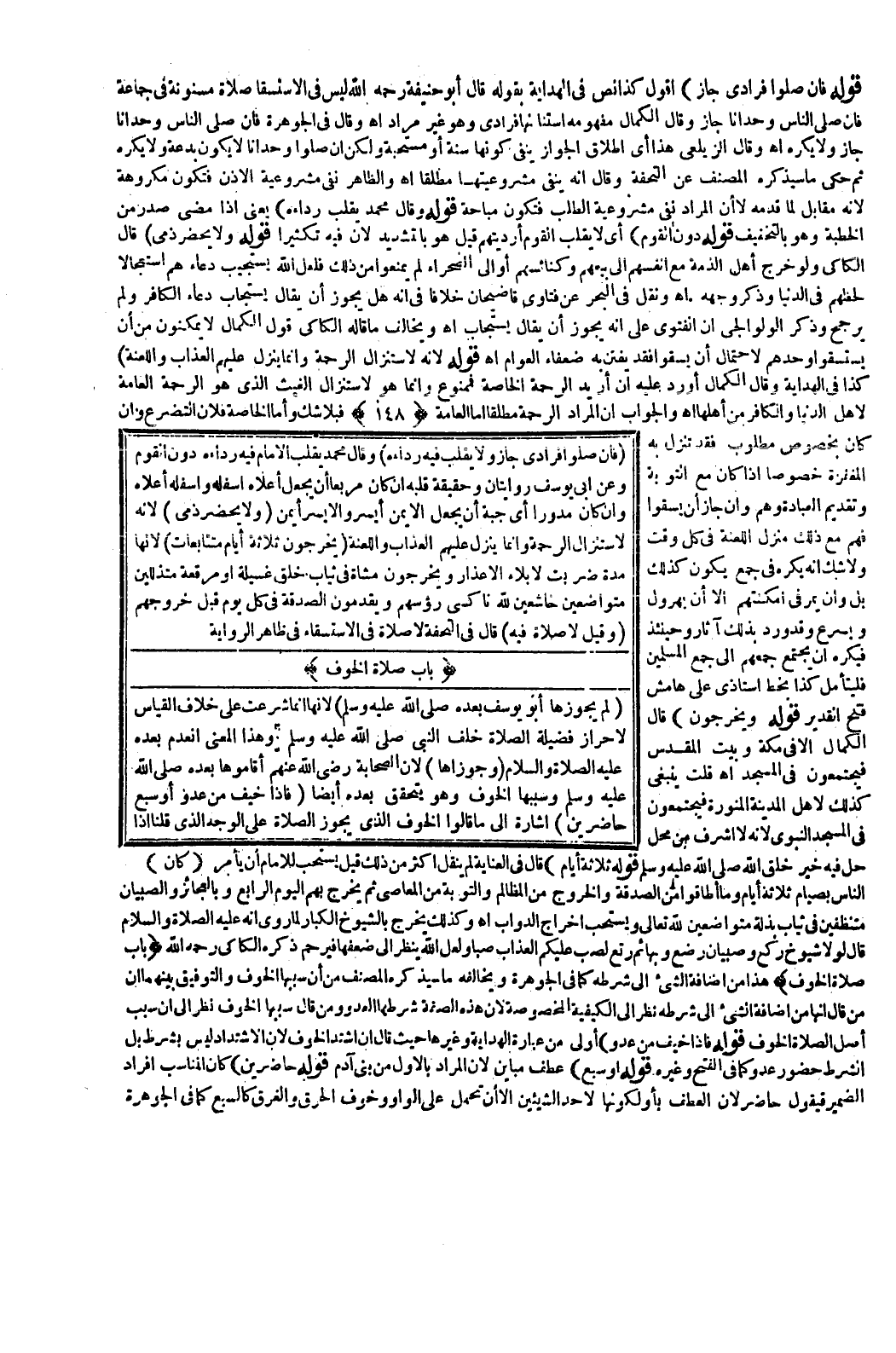 (بَابُ صَلَاةِ الْخَوْفِ) (لَمْ يُجَوِّزْهَا أَبُو يُوسُف بَعْدَهُ - صَلَّى اللَّهُ عَلَيْهِ وَسَلَّمَ -) ؛ لِأَنَّهَا إنَّمَا شُرِعَتْ عَلَى خِلَافِ الْقِيَاسِ لِإِحْرَازِ فَضِيلَةِ الصَّلَاةِ خَلْفَ النَّبِيِّ - صَلَّى اللَّهُ عَلَيْهِ وَسَلَّمَ - وَهَذَا الْمَعْنَى انْعَدَمَ بَعْدَهُ - عَلَيْهِ الصَّلَاةُ وَالسَّلَامُ - (وَجَوَّزَاهَا) ؛ لِأَنَّ الصَّحَابَةَ - رَضِيَ اللَّهُ عَنْهُمْ - أَقَامُوهَا بَعْدَهُ - صَلَّى اللَّهُ عَلَيْهِ وَسَلَّمَ - وَسَبَبُهَا الْخَوْفُ وَهُوَ يَتَحَقَّقُ بَعْدَهُ أَيْضًا (فَإِذَا خِيفَ مِنْ عَدُوٍّ أَوْ سَبُعٍ حَاضِرَيْنِ) إشَارَةٌ إلَى مَا قَالُوا الْخَوْفُ الَّذِي يَجُوزُ الصَّلَاةُ عَلَى الْوَجْهِ الَّذِي قُلْنَا إذَا