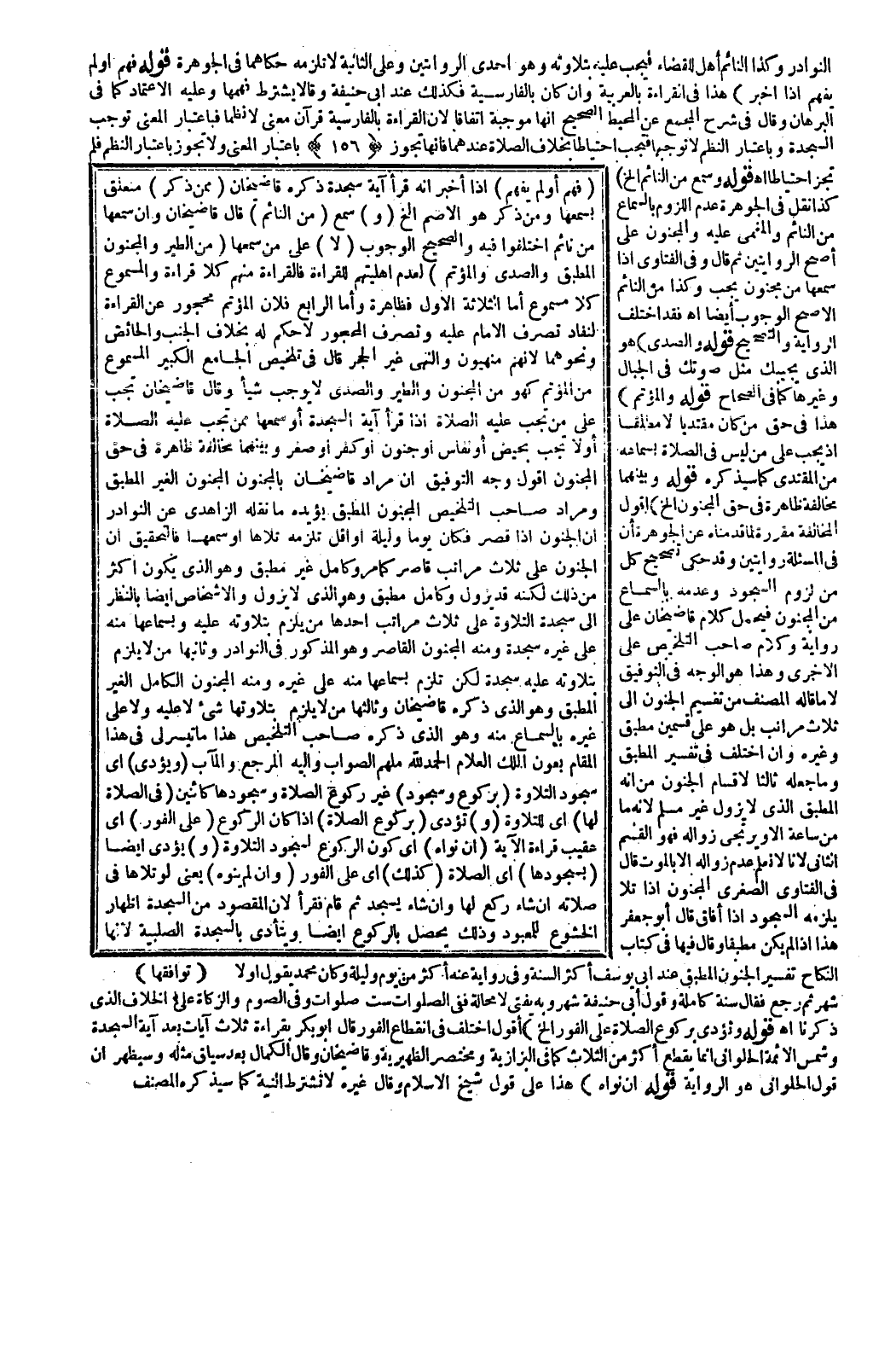 ـــــــــــــــــــــــــــــQالنَّوَادِرِ وَكَذَا النَّائِمُ أَهْلٌ لِلْقَضَاءِ فَيَجِبُ عَلَيْهِ بِتِلَاوَتِهِ وَهُوَ إحْدَى الرِّوَايَتَيْنِ وَعَلَى الثَّانِيَةِ لَا تَلْزَمُهُ حَكَاهُمَا فِي الْجَوْهَرَةِ (قَوْلُهُ فَهِمَ أَوْ لَمْ يَفْهَمْ إذَا أُخْبِرَ) هَذَا فِي الْقِرَاءَةِ بِالْعَرَبِيَّةِ وَإِنْ كَانَ بِالْفَارِسِيَّةِ فَكَذَلِكَ عِنْدَ أَبِي حَنِيفَةَ وَقَالَا يُشْرَطُ فَهْمُهَا وَعَلَيْهِ الِاعْتِمَادُ كَمَا فِي الْبُرْهَانِ وَقَالَ فِي شَرْحِ الْمَجْمَعِ عَنْ الْمُحِيطِ الصَّحِيحُ إنَّهَا مُوجَبَةٌ اتِّفَاقًا لِأَنَّ الْقِرَاءَةَ بِالْفَارِسِيَّةِ قُرْآنٌ مَعْنًى لَا نَظْمًا فَبِاعْتِبَارِ الْمَعْنَى تُوجِبُ السَّجْدَةَ وَبِاعْتِبَارِ النَّظْمِ لَا تُوجِبُهَا فَتَجِبُ احْتِيَاطًا بِخِلَافِ الصَّلَاةِ عِنْدَهُمَا، فَإِنَّهَا تَجُوزُ بِاعْتِبَارِ الْمَعْنَى وَلَا تَجُوزُ بِاعْتِبَارِ النَّظْمِ فَلَمْ تَجُزْ احْتِيَاطًا. اهـ.