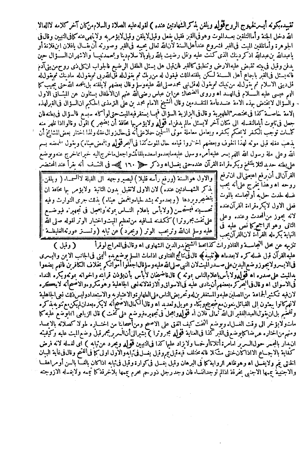 وَهَذَا يَخْرُجُ عَلَى أَنَّهُ يَجِبُ غُسْلُهُ لِحَدَثٍ حَلَّ بِهِ أَوْ لِنَجَاسَتِهِ بِالْمَوْتِ فَعَلَى الْأَوَّلِ لَا يُكْرَهُ قِرَاءَةُ الْقُرْآنِ عِنْدَهُ لِأَنَّهُ يَجُوزُ مِنْ الْمُحْدَثِ وَعِنْدَهُ وَعَلَى الثَّانِي وَهُوَ الرَّاجِحُ كَمَا نَصَّ عَلَيْهِ فِي النِّهَايَةِ يُكْرَهُ لَهُ الْقِرَاءَةُ لِأَنَّ الْقُرْآنَ يَجِبُ تَنْزِيهُهُ عَنْ مَحَلِّ النَّجَاسَةِ وَالْقَاذُورَاتِ كَذَا بِخَطِّ الشَّيْخِ بَدْرِ الدِّينِ الشَّهَاوِيِّ اهـ.