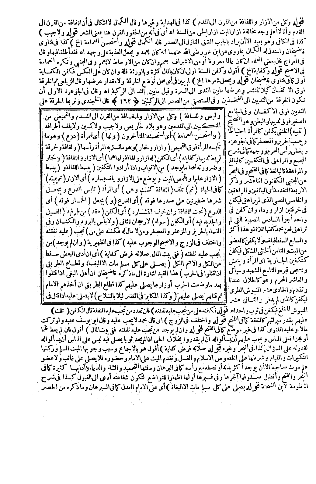 (قَوْلُهُ فَكَفَنُهُ عَلَى مَنْ تَجِبُ عَلَيْهِ نَفَقَتُهُ) أَقُولُ: فَإِنْ تَعَدَّدَ مَنْ تَجِبُ عَلَيْهِ النَّفَقَةُ فَالْكَفَنُ عَلَيْهِمْ بِقَدْرِ مِيرَاثِهِمْ كَالنَّفَقَةِ كَمَا فِي الْفَتْحِ (قَوْلُهُ: وَاخْتُلِفَ فِي الزَّوْجِ) أَيْ قَالَ لَا يَجِبُ عَلَيْهِ وَقَالَ أَبُو يُوسُفَ عَلَيْهِ وَلَوْ تَرَكَتْ مَالًا وَعَلَيْهِ الْفَتْوَى كَذَا فِي غَيْرِ مَوْضِعٍ كَمَا فِي الْفَتْحِ (قَوْلُهُ: وَإِنْ لَمْ يُوجَدْ مَنْ تَجِبُ عَلَيْهِ نَفَقَتُهُ فَفِي بَيْتِ الْمَالِ) أَقُولُ: فَإِنْ لَمْ يُعْطِ ظُلْمًا أَوْ عَجْزًا فَعَلَى النَّاسِ وَيَجِبُ عَلَيْهِمْ أَنْ يَسْأَلُوا لَهُ إنْ لَمْ يَقْدِرُوا بِخِلَافِ الْحَيِّ إذَا لَمْ يَجِدْ ثَوْبًا يُصَلِّي فِيهِ لَيْسَ عَلَى النَّاسِ أَنْ يَسْأَلُوا لَهُ لِقُدْرَتِهِ عَلَى سُؤَالٍ كَذَا فِي الْبَحْرِ وَغَيْرِهِ (قَوْلُهُ صَلَاتُهُ فَرْضُ كِفَايَةٍ) أَقُولُ هُوَ بِالْإِجْمَاعِ وَسَبَبُ وُجُوبِهَا الْمَيِّتُ الْمُسْلِمُ وَرُكْنُهَا التَّكْبِيرَاتُ وَالْقِيَامُ، وَشَرْطُهَا عَلَى الْخُصُوصِ الْإِسْلَامُ وَالْغُسْلُ وَتَقَدَّمَ الْمَيِّتُ عَلَى الْإِمَامِ وَحُضُورِهِ فَلَا يُصَلِّي عَلَى غَائِبٍ وَلَا عُضْوٍ عُلِمَ مَوْتُ صَاحِبِهِ إلَّا أَنْ يُوجَدَ أَكْثَرُ بَدَنِهِ أَوْ نِصْفُهُ مَعَ رَأْسٍ كَمَا فِي الْبُرْهَانِ وَسُنَّتُهَا التَّحْمِيدُ وَالثَّنَاءُ وَالدُّعَاءُ وَآدَابُهَا كَثِيرَةٌ كَمَا فِي الْبَحْرِ وَالْفَتْحِ وَأَفْضَلُ صُفُوفِهَا آخِرُهَا وَفِي غَيْرِهَا أَوَّلُهَا إظْهَارًا لِلتَّوَاضُعِ لِتَكُونَ شَفَاعَتُهُ أَدْعَى إلَى الْقَبُولِ كَذَا فِي شَرْحِ الْمَنْظُومَةِ لِابْنِ الشِّحْنَةِ