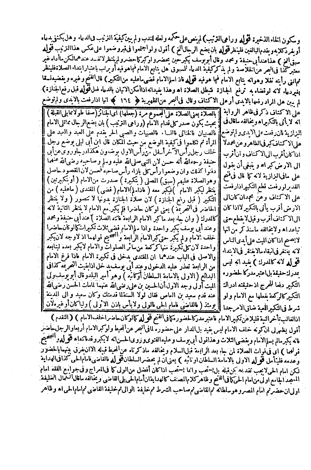 (قَوْلُهُ: وَرَاعَى التَّرْتِيبَ) لَمْ يَنُصَّ عَلَى حُكْمِهِ وَلَعَلَّهُ لِلنَّدْبِ وَلَمْ يُبَيِّنْ كَيْفِيَّةَ التَّرْتِيبِ فِي الدُّعَاءِ وَهَلْ يُكْتَفَى بِدُعَاءٍ أَوْ يُفْرِدُ كُلًّا بِهِ وَيُقَدِّمُ الْبَالِغِينَ فَلْيَنْظُرْ (قَوْلُهُ: بِأَنْ يَضَعَ الرِّجَالَ. . . إلَخْ) أَقُولُ وَلَوْ اجْتَمَعُوا فِي قَبْرٍ وُضِعُوا عَلَى عَكْسِ هَذَا التَّرْتِيبِ (قَوْلُهُ: سَبَقَ. . . إلَخْ) هَذَا عِنْدَ أَبِي حَنِيفَةَ وَمُحَمَّدٍ وَقَالَ أَبُو يُوسُفَ يُكَبِّرُ حِينَ يَحْضُرُ وَلَوْ كَبَّرَ لَمَّا حَضَرَ وَلَمْ يَنْتَظِرْ لَا تَفْسُدُ عِنْدَهُمَا لَكِنْ مَا أَدَّاهُ غَيْرُ مُعْتَبَرٍ كَذَا فِي الْبَحْرِ عَلَى الْخُلَاصَةِ وَلَمْ يَذْكُرْ كَيْفِيَّةَ الدُّعَاءِ لِلْمَسْبُوقِ هَلْ يُتَابِعُ الْإِمَامَ فِيمَا هُوَ فِيهِ أَوْ يُرَتِّبُ بِاعْتِبَارِ ابْتِدَاءِ الصَّلَاةِ فَيُنْظَرُ ثُمَّ إنَّنِي رَأَيْتُهُ نَقْلًا وَهُوَ أَنَّهُ يُتَابِعُ الْإِمَامَ فِيمَا هُوَ فِيهِ