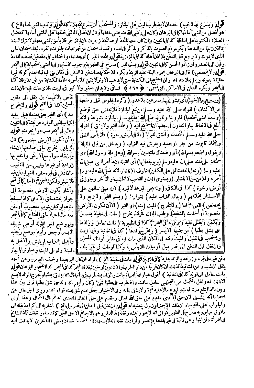 (قَوْلُهُ: وَنُدِبَ الْمَشْيُ خَلْفَهَا. . . إلَخْ) هُوَ أَفْضَلُ مِنْ الْمَشْيِ أَمَامَهَا كَمَا فِي الْبُرْهَانِ وَكَانَ عَلِيٌّ - رَضِيَ اللَّهُ عَنْهُ - يَمْشِي خَلْفًا وَقَالَ: إنَّ فَضْلَ الْمَاشِي خَلْفَهَا عَلَى الْمَاشِي أَمَامَهَا كَفَضْلِ الصَّلَاةِ الْمَكْتُوبَةِ عَلَى النَّافِلَةِ كَذَا فِي التَّبْيِينِ، وَإِنْ كَانَ مَعَهَا نَائِحَةٌ أَوْ صَائِحَةٌ زُجِرَتْ، فَإِنْ لَمْ تَنْزَجِرْ فَلَا بَأْسَ بِالْمَشْيِ مَعَهَا وَلَا تُتْرَكُ السُّنَّةُ بِمَا اُقْتُرِنَ بِهَا مِنْ الْبِدْعَةِ وَيُكْرَهُ رَفْعُ الصَّوْتِ بِالذِّكْرِ وَيَذْكُرُ فِي نَفْسِهِ وَقَدْ جَاءَ سُبْحَانَ مَنْ قَهَرَ عِبَادَهُ بِالْمَوْتِ وَتَفَرَّدَ بِالْبَقَاءِ سُبْحَانَ الْحَيِّ الَّذِي لَا يَمُوتُ وَلَا يَرْجِعُ قَبْلَ الدَّفْنِ بِلَا إذْنِ أَهْلِهِ كَذَا فِي الْبَزَّازِيَّةِ (قَوْلُهُ: وَيُلْحَدُ الْقَبْرُ) أَيْ بَعْدَ عُمْقِهِ وَاخْتَلَفُوا فِي عُمْقِهِ قِيلَ نِصْفُ الْقَامَةِ وَقِيلَ إلَى الصَّدْرِ، وَإِنْ زَادَ فَحَسَنٌ كَمَا فِي التَّبْيِينِ (قَوْلُهُ: وَيُسَنَّمُ الْقَبْرُ) صَرَّحَ فِي الظَّهِيرِيَّةِ بِوُجُوبِ التَّسْنِيمِ.