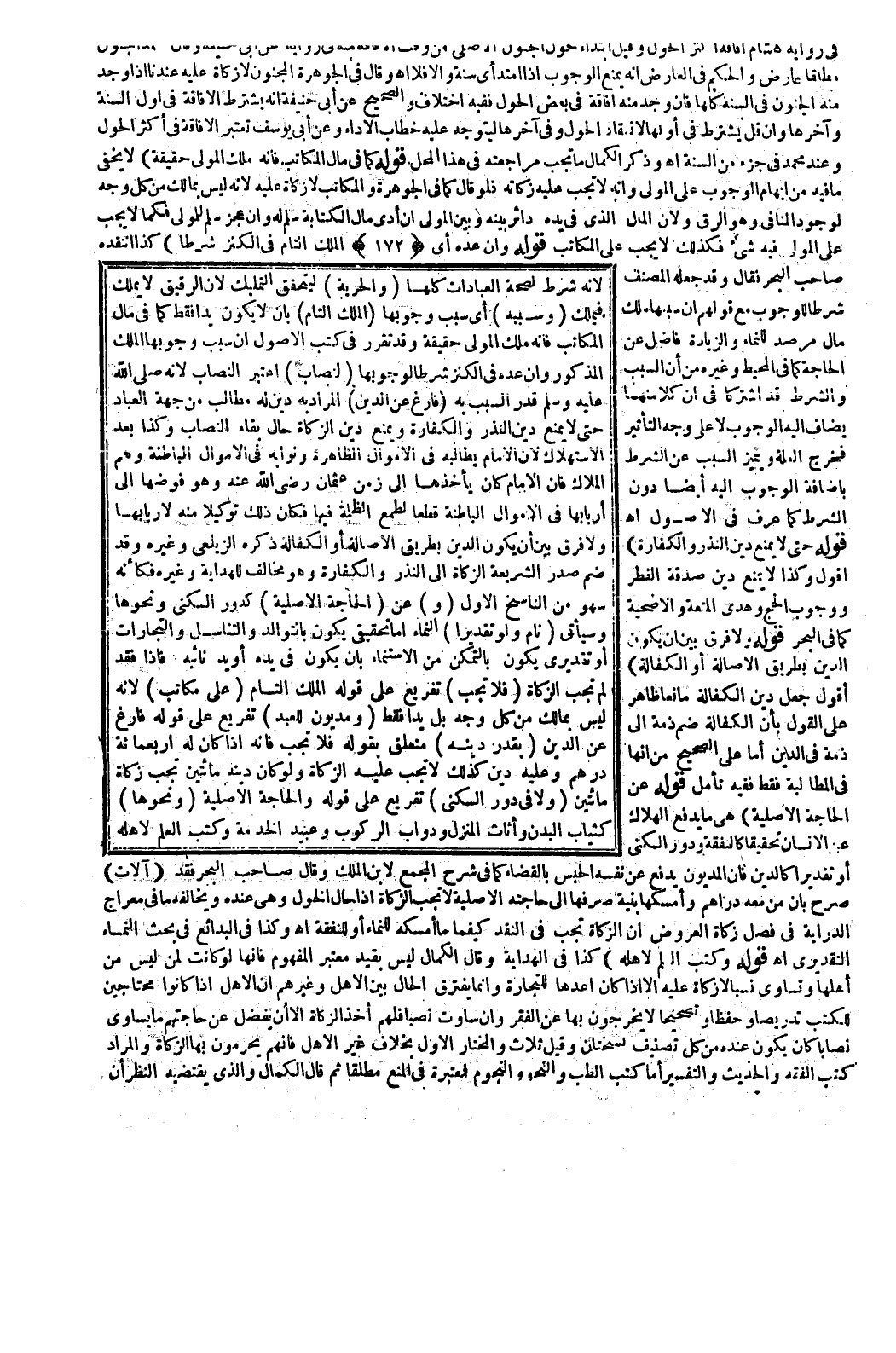 لِأَنَّهُ شَرْطٌ لِصِحَّةِ الْعِبَادَاتِ كُلِّهَا (وَالْحُرِّيَّةُ) لِيَتَحَقَّقَ التَّمْلِيكُ لِأَنَّ الرَّقِيقَ لَا يَمْلِكُ فَيُمْلَكُ (وَسَبَبُهُ) أَيْ سَبَبُ وُجُوبِهَا (الْمِلْكُ التَّامُّ) بِأَنْ لَا يَكُونَ يَدًا فَقَطْ كَمَا فِي مَالِ الْمُكَاتَبِ، فَإِنَّهُ مِلْكُ الْمَوْلَى حَقِيقَةً وَقَدْ تَقَرَّرَ فِي كُتُبِ الْأُصُولِ أَنَّ سَبَبَ وُجُوبِهَا الْمِلْكُ الْمَذْكُورُ وَإِنْ عَدَّهُ فِي الْكَنْزِ شَرْطًا لِوُجُوبِهَا (لِنِصَابٍ) اُعْتُبِرَ النِّصَابُ لِأَنَّهُ - صَلَّى اللَّهُ عَلَيْهِ وَسَلَّمَ - قَدَّرَ السَّبَبَ بِهِ (فَارِغٍ عَنْ الدَّيْنِ) الْمُرَادُ بِهِ دَيْنٌ لَهُ مُطَالِبٌ مِنْ جِهَةِ الْعِبَادِ حَتَّى لَا يَمْنَعَ دَيْنَ النَّذْرِ وَالْكَفَّارَةِ وَيَمْنَعَ دَيْنَ الزَّكَاةِ حَالَ بَقَاءِ النِّصَابِ وَكَذَا بَعْدَ الِاسْتِهْلَاكِ؛ لِأَنَّ الْإِمَامَ يُطَالِبُهُ فِي الْأَمْوَالِ الظَّاهِرَةِ وَنُوَّابَهُ فِي الْأَمْوَالِ الْبَاطِنَةِ وَهُمْ الْمُلَّاكُ، فَإِنَّ الْإِمَامَ كَانَ يَأْخُذُهَا إلَى زَمَنِ عُثْمَانَ - رَضِيَ اللَّهُ عَنْهُ - وَهُوَ فَوَّضَهَا إلَى أَرْبَابِهَا فِي الْأَمْوَالِ الْبَاطِنَةِ قَطْعًا لِطَمَعِ الظَّلَمَةِ فِيهَا فَكَانَ ذَلِكَ تَوْكِيلًا مِنْهُ لِأَرْبَابِهَا وَلَا فَرْقَ بَيْنَ أَنْ يَكُونَ الدَّيْنُ بِطَرِيقِ الْأَصَالَةِ أَوْ الْكَفَالَةِ ذَكَرَهُ الزَّيْلَعِيُّ وَغَيْرُهُ وَقَدْ ضَمَّ صَدْرُ الشَّرِيعَةِ الزَّكَاةَ إلَى النَّذْرِ وَالْكَفَّارَةِ وَهُوَ مُخَالِفٌ لِلْهِدَايَةِ وَغَيْرِهِ فَكَأَنَّهُ سَهْوٌ مِنْ النَّاسِخِ الْأَوَّلِ (وَ) عَنْ (الْحَاجَةِ الْأَصْلِيَّةِ) كَدُورِ السُّكْنَى وَنَحْوِهَا وَسَيَأْتِي (نَامٍ وَلَوْ تَقْدِيرًا) النَّمَاءُ إمَّا تَحْقِيقِيٌّ يَكُونُ بِالتَّوَالُدِ وَالتَّنَاسُلِ وَالتِّجَارَاتِ أَوْ تَقْدِيرِيٌّ يَكُونُ بِالتَّمَكُّنِ مِنْ الِاسْتِنْمَاءِ أَنْ يَكُونَ فِي يَدِهِ أَوْ يَدِ نَائِبِهِ، فَإِذَا فُقِدَ لَمْ تَجِبْ الزَّكَاةُ