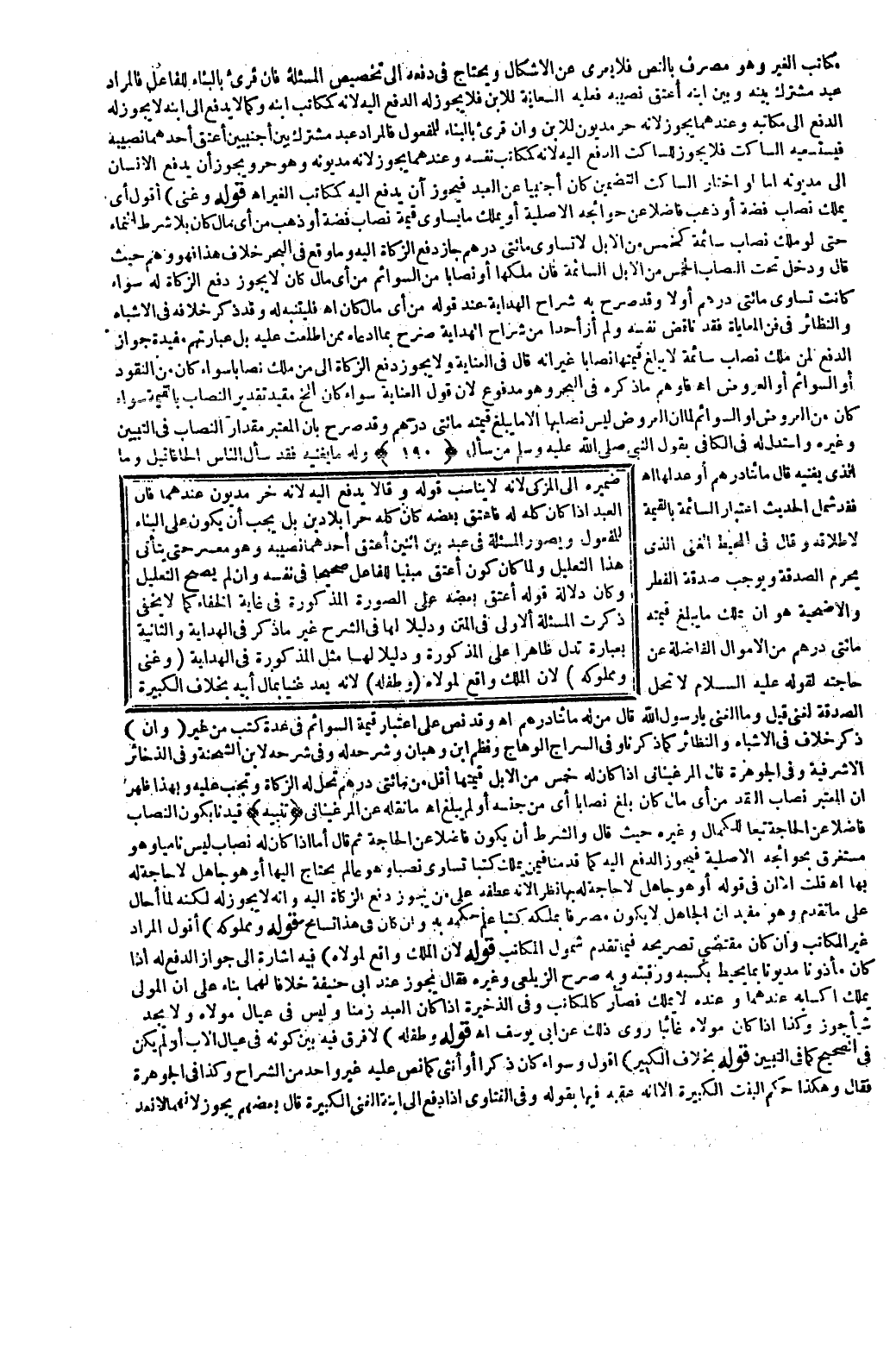 (تَنْبِيهٌ) : قَيَّدْنَا بِكَوْنِ النِّصَابِ فَاضِلًا عَنْ الْحَاجَةِ تَبَعًا لِلْكَمَالِ وَغَيْرِهِ حَيْثُ قَالَ وَالشَّرْطُ أَنْ يَكُونَ فَاضِلًا عَنْ الْحَاجَةِ ثُمَّ قَالَ أَمَّا إذَا كَانَ لَهُ نِصَابٌ لَيْسَ نَامِيًا وَهُوَ مُسْتَغْرَقٌ بِحَوَائِجِهِ الْأَصْلِيَّةِ فَيَجُوزُ الدَّفْعُ إلَيْهِ كَمَا قَدَّمْنَا فِيمَنْ يَمْلِكُ كُتُبًا تُسَاوِي نُصُبًا وَهُوَ عَالِمٌ يَحْتَاجُ إلَيْهَا أَوْ هُوَ جَاهِلٌ لَا حَاجَةَ لَهُ بِهَا. اهـ. قُلْت إلَّا أَنَّ فِي قَوْلِهِ أَوْ هُوَ جَاهِلٌ لَا حَاجَةَ لَهُ بِهَا نَظَرًا؛ لِأَنَّهُ عَطَفَهُ عَلَى مَنْ يَجُوزُ دَفْعُ الزَّكَاةِ إلَيْهِ وَأَنَّهُ لَا يَجُوزُ لَهُ لَكِنَّهُ لَمَّا أَحَالَ عَلَى مَا تَقَدَّمَ وَهُوَ مُفِيدٌ أَنَّ الْجَاهِلَ لَا يَكُونُ مُصَرِّفًا بِمِلْكِهِ كُتُبًا عُلِمَ حُكْمُهُ بِهِ، وَإِنْ كَانَ فِي هَذَا تَسَامُحٌ (قَوْلُهُ وَمَمْلُوكِهِ) أَقُولُ الْمُرَادُ غَيْرُ الْمُكَاتَبِ، وَإِنْ كَانَ مُقْتَضَى تَصْرِيحِهِ فِيمَا تَقَدَّمَ شُمُولَ الْمُكَاتَبِ (قَوْلُهُ: لِأَنَّ الْمِلْكَ وَاقِعٌ لِمَوْلَاهُ) فِيهِ إشَارَةٌ إلَى جَوَازِ الدَّفْعِ لَهُ إذَا كَانَ مَأْذُونًا مَدْيُونًا بِمَا يُحِيطُ بِكَسْبِهِ وَرَقَبَتِهِ وَبِهِ صَرَّحَ الزَّيْلَعِيُّ وَغَيْرُهُ فَقَالَ يَجُوزُ عِنْدَ أَبِي حَنِيفَةَ خِلَافًا لَهُمَا بِنَاءً عَلَى أَنَّ الْمَوْلَى يَمْلِكُ إكْسَابَهُ عِنْدَهُمَا وَعِنْدَهُ لَا يَمْلِكُ فَصَارَ كَالْمُكَاتَبِ.