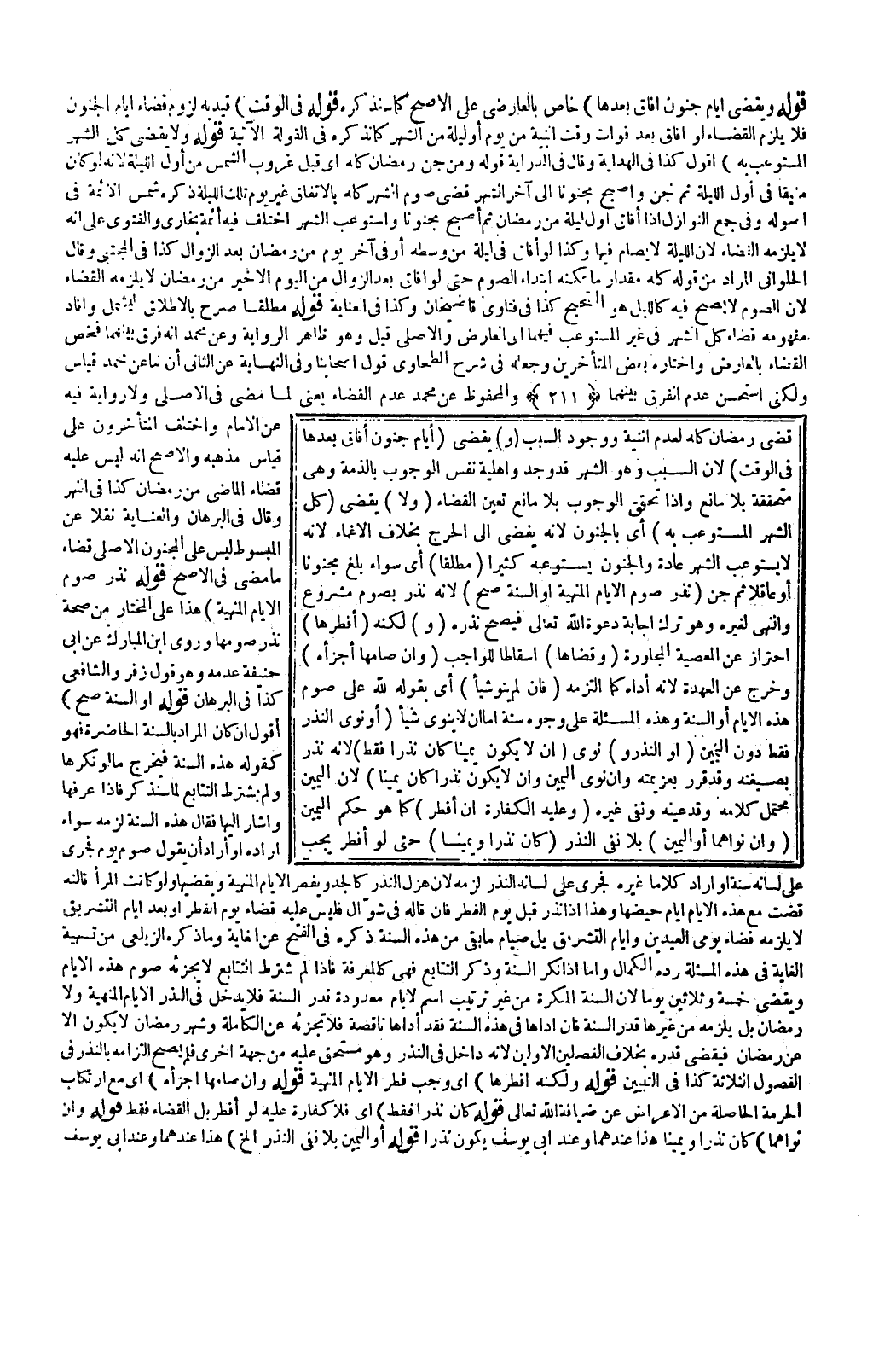 وَفِي جَمْعِ النَّوَازِلِ إذَا أَفَاقَ أَوَّلَ لَيْلَةٍ مِنْ رَمَضَانَ ثُمَّ أَصْبَحَ مَجْنُونًا وَاسْتَوْعَبَ الشَّهْرَ اخْتَلَفَ فِيهِ أَئِمَّةُ بُخَارَى وَالْفَتْوَى عَلَى أَنَّهُ لَا يَلْزَمُهُ الْقَضَاءُ؛ لِأَنَّ اللَّيْلَةَ لَا يُصَامُ فِيهَا، وَكَذَا لَوْ أَفَاقَ فِي لَيْلَةٍ مِنْ وَسَطِهِ أَوْ فِي آخِرِ يَوْمٍ مِنْ رَمَضَانَ بَعْدَ الزَّوَالِ كَذَا فِي الْمُجْتَبَى وَقَالَ الْحَلْوَانِيُّ الْمُرَادُ مِنْ قَوْلِهِ كُلُّهُ مِقْدَارُ مَا يُمْكِنُهُ ابْتِدَاءُ الصَّوْمِ حَتَّى لَوْ أَفَاقَ بَعْدَ الزَّوَالِ مِنْ الْيَوْمِ الْأَخِيرِ مِنْ رَمَضَانَ لَا يَلْزَمُهُ الْقَضَاءُ؛ لِأَنَّ الصَّوْمَ لَا يَصِحُّ فِيهِ كَاللَّيْلِ هُوَ الصَّحِيحُ كَذَا فِي فَتَاوَى قَاضِي خَانْ، وَكَذَا فِي الْعِنَايَةِ (قَوْلُهُ مُطْلَقًا) صَرَّحَ بِالْإِطْلَاقِ لِيَشْمَلَ وَأَفَادَ مَفْهُومُهُ قَضَاءَ كُلِّ الشَّهْرِ فِي غَيْرِ الْمُسْتَوْعَبِ فِيهِمَا أَيْ الْعَارِضِ وَالْأَصْلِيِّ قِيلَ: وَهُوَ ظَاهِرُ الرِّوَايَةِ، وَعَنْ مُحَمَّدٍ أَنَّهُ فَرَّقَ بَيْنَهُمَا فَخَصَّ الْقَضَاءَ بِالْعَارِضِ وَاخْتَارَهُ بَعْضُ الْمُتَأَخِّرِينَ وَجَعَلَهُ فِي شَرْحِ الطَّحَاوِيِّ قَوْلَ أَصْحَابِنَا.