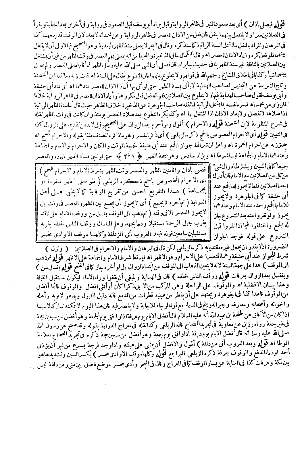 فَصَلَّى بِأَذَانٍ وَإِقَامَتَيْنِ الظُّهْرَ وَالْعَصْرَ وَقْتَ الظُّهْرِ بِشَرْطِ الْإِمَامِ وَالْإِحْرَامِ لِلْحَجِّ) أَيْ الْإِحْرَامِ الْمَخْصُوصِ بِالْحَجِّ ذَكَرَهُ الزَّيْلَعِيُّ (فَلَوْ صَلَّى الظُّهْرَ مُنْفَرِدًا أَوْ بِجَمَاعَةٍ) هَذَا التَّفْرِيعُ أَحْسَنُ مِنْ تَفْرِيعِ الْوِقَايَةِ كَمَا لَا يَخْفَى عَلَى أَهْلِ الدِّرَايَةِ (ثُمَّ أَحْرَمَ لَا يَجْمَعُ) أَيْ لَا يَجُوزُ أَنْ يَجْمَعَ بَيْنَ الظُّهْرِ وَالْعَصْرِ فِي وَقْتٍ بَلْ لَا يَجُوزُ الْعَصْرُ إلَّا فِي وَقْتِهِ (ثُمَّ ذَهَبَ إلَى الْمَوْقِفِ بِغُسْلٍ سُنَّ وَوَقَفَ الْإِمَامُ عَلَى نَاقَتِهِ بِقُرْبِ جَبَلِ الرَّحْمَةِ مُسْتَقْبِلًا، وَدَعَا بِجُهْدٍ وَعَلَّمَ الْمَنَاسِكَ وَوَقَفَ النَّاسُ خَلْفَهُ بِقُرْبِهِ مُسْتَقْبِلِينَ سَامِعِينَ قَوْلَهُ فَبَعْدَ الْغُرُوبِ أَتَى الْمُزْدَلِفَةِ وَكُلُّهَا مَوْقِفٌ إلَّا وَادِيَ مُحَسِّرٍ