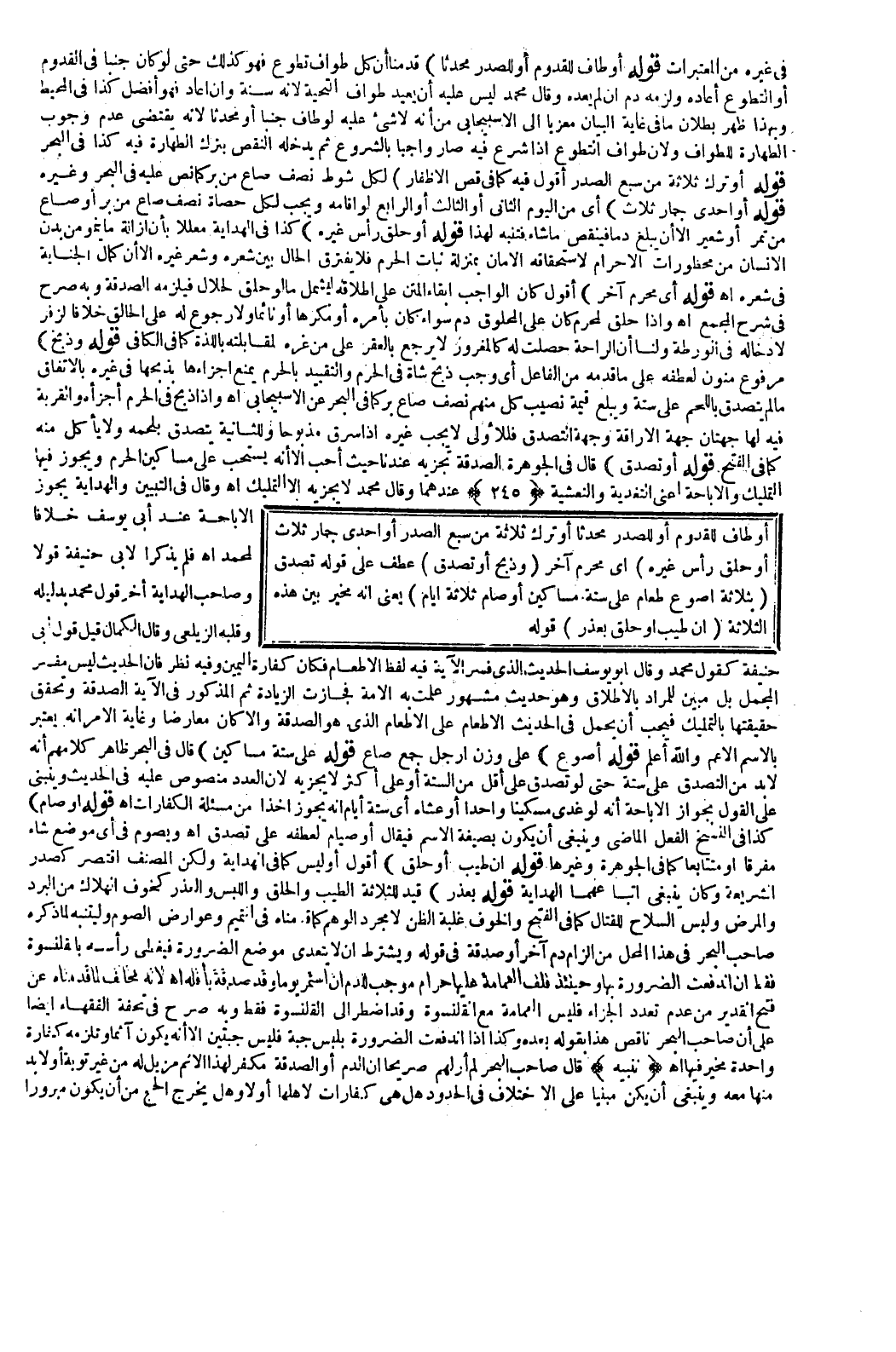 وَقَالَ مُحَمَّدٌ لَيْسَ عَلَيْهِ أَنْ يُعِيدَ طَوَافَ التَّحِيَّةِ؛ لِأَنَّهُ سُنَّةٌ وَإِنْ أَعَادَ فَهُوَ أَفْضَلُ كَذَا فِي الْمُحِيطِ وَبِهَذَا ظَهَرَ بُطْلَانُ مَا فِي غَايَةِ الْبَيَانِ مَعْزِيًّا إلَى الْإِسْبِيجَابِيِّ مِنْ أَنَّهُ لَا شَيْءَ عَلَيْهِ لَوْ طَافَ جُنُبًا أَوْ مُحْدِثًا؛ لِأَنَّهُ يَقْتَضِي عَدَمَ وُجُوبِ الطَّهَارَةِ لِلطَّوَافِ؛ وَلِأَنَّ طَوَافَ التَّطَوُّعِ إذَا شُرِعَ فِيهِ صَارَ وَاجِبًا بِالشُّرُوعِ، ثُمَّ يَدْخُلُهُ النَّقْصُ بِتَرْكِ الطَّهَارَةِ فِيهِ كَذَا فِي الْبَحْرِ (قَوْلُهُ: أَوْ تَرَكَ ثَلَاثَةً مِنْ سُبْعِ الصَّدْرِ) أَقُولُ فِيهِ كَمَا فِي قَصِّ الْأَظْفَارِ لِكُلِّ شَوْطٍ نِصْفُ صَاعٍ مِنْ بُرٍّ كَمَا نَصَّ عَلَيْهِ فِي الْبَحْرِ وَغَيْرِهِ (قَوْلُهُ: أَوْ إحْدَى جِمَارٍ ثَلَاثٍ) أَيْ فِي الْيَوْمِ الثَّانِي أَوْ الثَّالِثِ أَوْ الرَّابِعِ لَوْ أَقَامَهُ وَيَجِبُ لِكُلِّ حَصَاةٍ نِصْفُ صَاعٍ مِنْ بُرٍّ أَوْ صَاعٌ مِنْ تَمْرٍ أَوْ شَعِيرٍ إلَّا أَنْ يَبْلُغَ دَمًا فَيُنْقِصُ مَا شَاءَ فَتَنَبَّهْ لِهَذَا.