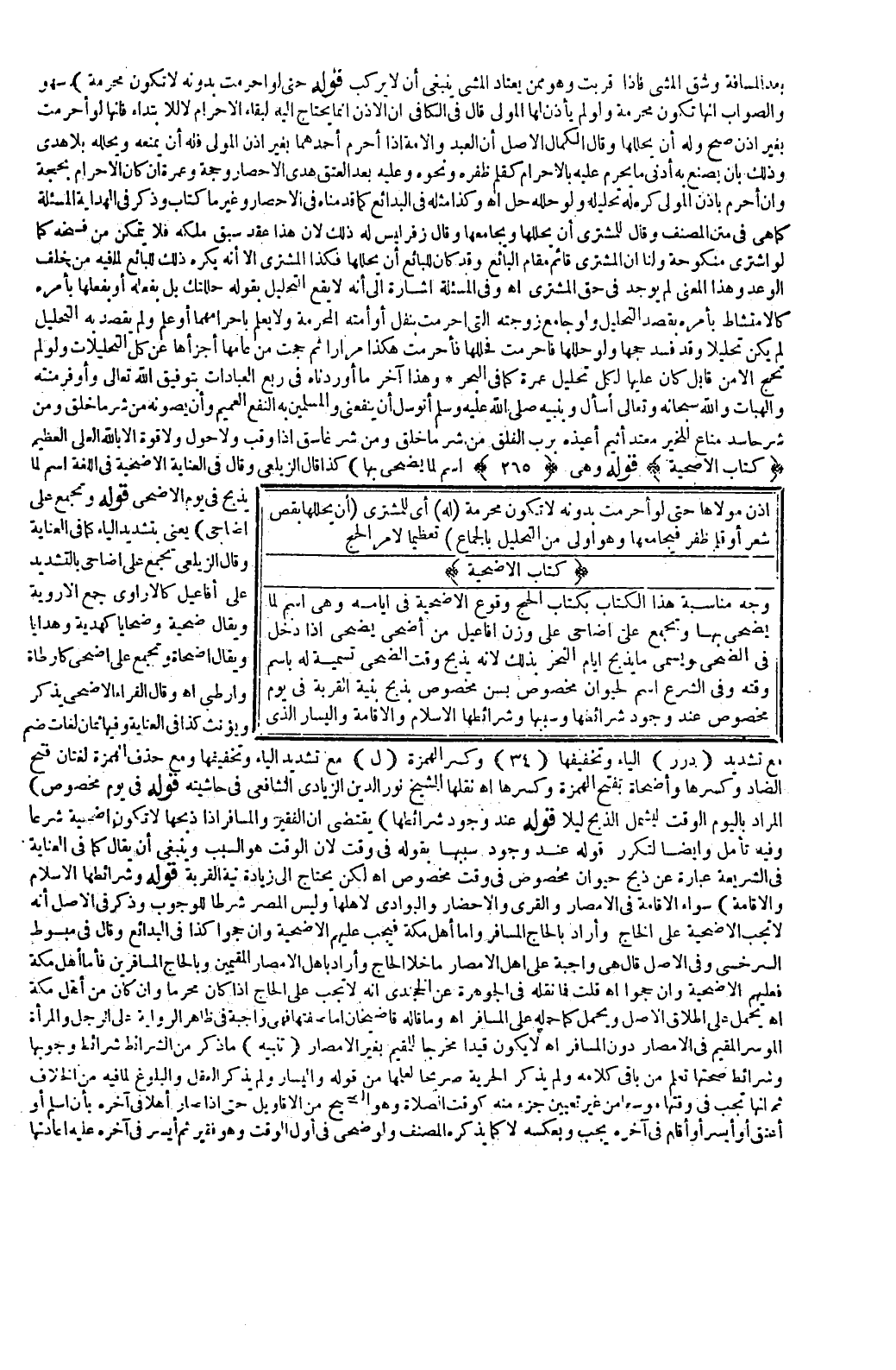 {كِتَابُ الْأُضْحِيَّةِ. وَجْهُ مُنَاسَبَةِ هَذَا الْكِتَابِ بِكِتَابِ الْحَجِّ وُقُوعُ الْأُضْحِيَّةِ فِي أَيَّامِهِ وَهِيَ اسْمٌ لِمَا يُضَحَّى بِهَا وَتُجْمَعُ عَلَى أَضَاحِيَّ عَلَى وَزْنِ أَفَاعِلَ مِنْ أَضْحَى يُضْحِي إذَا دَخَلَ فِي الضُّحَى وَيُسَمَّى مَا يُذْبَحُ أَيَّامَ النَّحْرِ بِذَلِكَ؛ لِأَنَّهُ يُذْبَحُ وَقْتَ الضُّحَى تَسْمِيَةً لَهُ بِاسْمِ وَقْتِهِ وَفِي الشَّرْعِ اسْمٌ لِحَيَوَانٍ مَخْصُوصٍ بِسِنٍّ مَخْصُوصٍ يُذْبَحُ بِنِيَّةِ الْقُرْبَةِ فِي يَوْمٍ مَخْصُوصٍ عِنْدَ وُجُودِ شَرَائِطِهَا وَسَبَبِهَا، وَشَرَائِطُهَا الْإِسْلَامُ وَالْإِقَامَةُ وَالْيَسَارُ الَّذِي