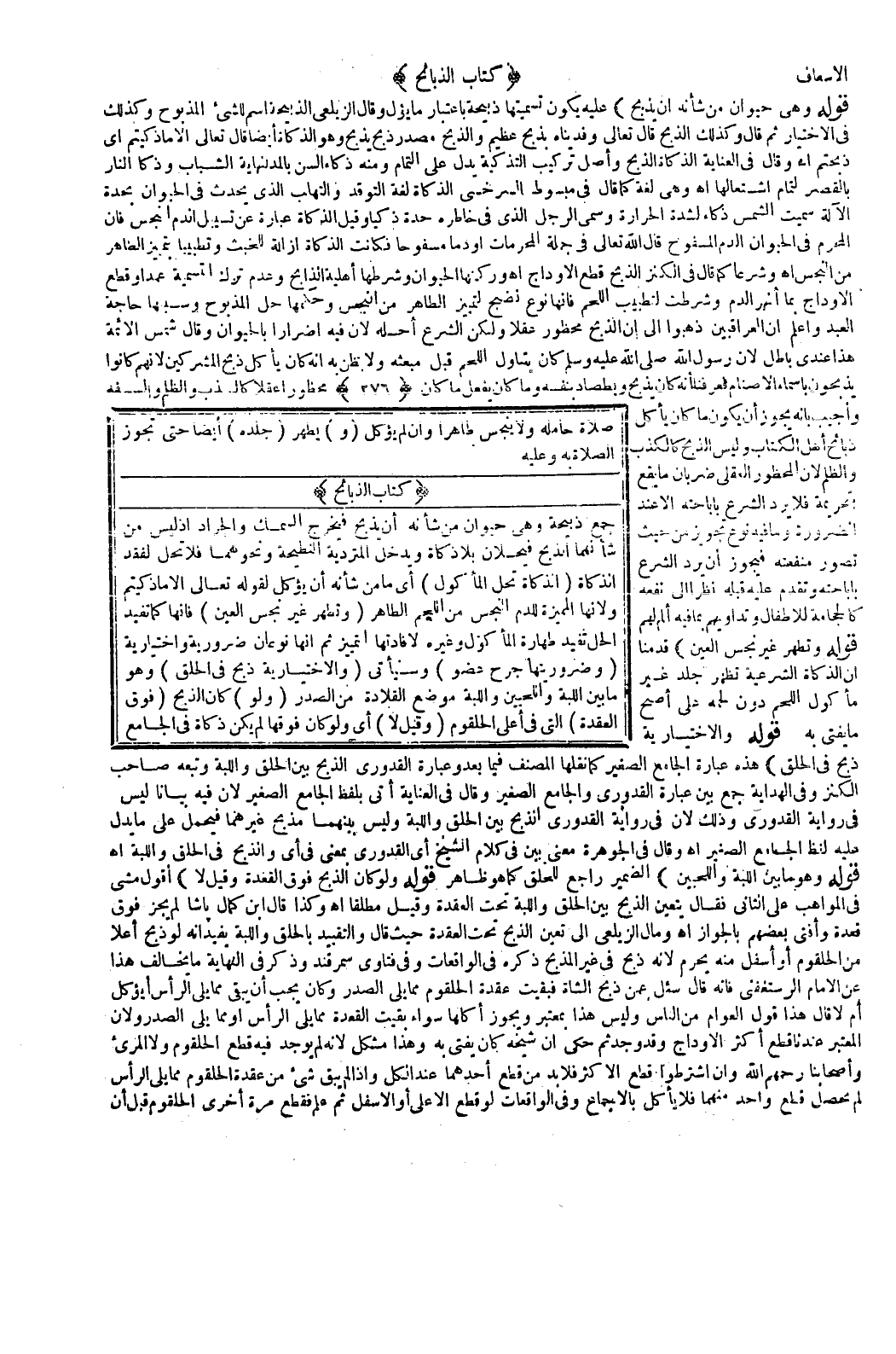 وَقَالَ فِي الْعِنَايَةِ أَتَى بِلَفْظِ الْجَامِعِ الصَّغِيرِ؛ لِأَنَّ فِيهِ بَيَانًا لَيْسَ فِي رِوَايَةِ الْقُدُورِيِّ وَذَلِكَ؛ لِأَنَّ فِي رِوَايَةِ الْقُدُورِيِّ الذَّبْحَ بَيْنَ الْحَلْقِ وَاللَّبَّةِ وَلَيْسَ بَيْنَهُمَا مَذْبَحٌ غَيْرُهُمَا فَيُحْمَلُ عَلَى مَا يَدُلُّ عَلَيْهِ لَفْظُ الْجَامِعِ الصَّغِيرِ اهـ.