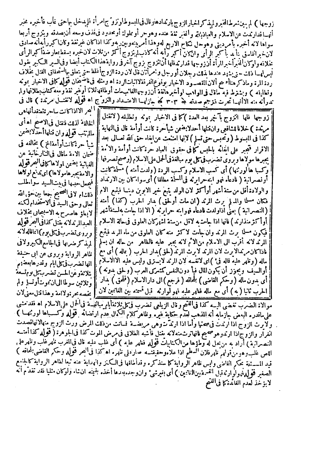 وَقَالَ فِي الْمَبْسُوطِ لَوْ تَزَوَّجَ امْرَأَةً فَلَمْ يَدْخُلْ بِهَا حَتَّى غَابَ فَأَخْبَرَهُ مُخْبِرٌ أَنَّهَا قَدْ ارْتَدَّتْ عَنْ الْإِسْلَامِ وَالْعِيَاذُ بِاَللَّهِ وَالْمُخْبِرُ ثِقَةٌ عِنْدَهُ وَهُوَ حُرٌّ أَوْ مَمْلُوكٌ أَوْ مَحْدُودٌ فِي قَذْفٍ وَسِعَهُ أَنْ يُصَدِّقَهُ وَيَتَزَوَّجَ أَرْبَعًا سِوَاهَا؛ لِأَنَّهُ أَخْبَرَهُ بِأَمْرٍ دِينِيٍّ وَهُوَ حَلَّ نِكَاحُ الْأَرْبَعِ لَهُ وَهَذَا أَمْرٌ بَيْنَهُ وَبَيْنَ رَبِّهِ وَكَذَا إذَا كَانَ غَيْرَ ثِقَةٍ وَكَانَ أَكْبَرُ رَأْيِهِ أَنَّهُ صَادِقٌ؛ لِأَنَّ خَبَرَ الْفَاسِقِ يَتَأَيَّدُ بِأَكْبَرِ الرَّأْيِ وَإِنْ كَانَ أَكْبَرُ رَأْيِهِ أَنَّهُ كَاذِبٌ لَمْ يَتَزَوَّجْ أَكْثَرَ مِنْ ثَلَاثٍ؛ لِأَنَّ خَبَرَهُ يَسْقُطُ بِمُعَارَضَةِ أَكْبَرِ الرَّأْيِ بِخِلَافِهِ وَلَوْ كَانَ الْمُخْبِرُ أَخْبَرَ الْمَرْأَةَ أَنَّ زَوْجَهَا قَدْ ارْتَدَّ فَلَهَا أَنْ تَتَزَوَّجَ بِزَوْجٍ آخَرَ فِي رِوَايَةِ هَذَا الْكِتَابِ أَيْضًا،.