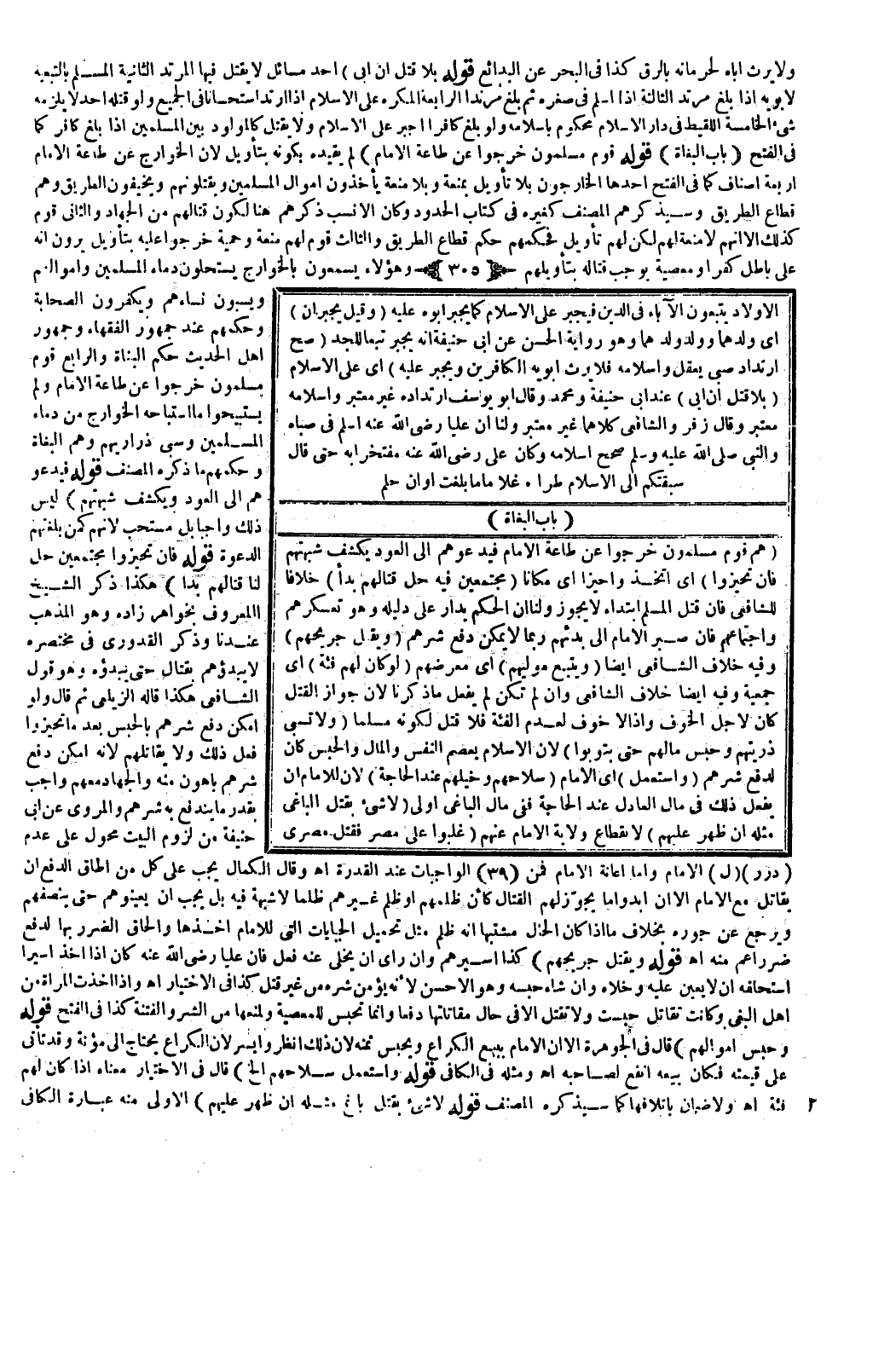 (قَوْلُهُ: قَوْمٌ مُسْلِمُونَ خَرَجُوا عَنْ طَاعَةِ الْإِمَامِ) لَمْ يُقَيِّدْهُ بِكَوْنِهِ بِتَأْوِيلٍ؛ لِأَنَّ الْخَوَارِجَ عَنْ طَاعَةِ الْإِمَامِ أَرْبَعَةُ أَصْنَافٍ كَمَا فِي الْفَتْحِ: أَحَدُهَا: الْخَارِجُونَ بِلَا تَأْوِيلٍ بِمَنَعَةٍ وَبِلَا مَنَعَةٍ يَأْخُذُونَ أَمْوَالَ الْمُسْلِمِينَ وَيَقْتُلُونَهُمْ وَيُخِيفُونَ الطَّرِيقَ وَهُمْ قُطَّاعُ الطَّرِيقِ وَسَيَذْكُرُهُمْ الْمُصَنِّفُ كَغَيْرِهِ فِي كِتَابِ الْحُدُودِ وَكَانَ الْأَنْسَبُ ذِكْرَهُمْ هُنَا لِكَوْنِ قِتَالِهِمْ مِنْ الْجِهَادِ. وَالثَّانِي: قَوْمٌ كَذَلِكَ إلَّا أَنَّهُمْ لَا مَنَعَةَ لَهُمْ لَكِنْ لَهُمْ تَأْوِيلٌ فَحُكْمُهُمْ حُكْمُ قُطَّاعِ الطَّرِيقِ. وَالثَّالِثُ: قَوْمٌ لَهُمْ مَنَعَةٌ وَحَمِيَّةٌ خَرَجُوا عَلَيْهِ بِتَأْوِيلٍ يَرَوْنَ أَنَّهُ عَلَى بَاطِلٍ كُفْرٍ أَوْ مَعْصِيَةٍ يُوجِبُ قِتَالَهُ بِتَأْوِيلِهِمْ وَهَؤُلَاءِ يَسْمَعُونَ بِالْخَوَارِجِ يَسْتَحِلُّونَ دِمَاءَ الْمُسْلِمِينَ وَأَمْوَالَهُمْ وَيَسْبُونَ نِسَاءَهُمْ وَيُكَفِّرُونَ الصَّحَابَةَ وَحُكْمُهُمْ عِنْدَ جُمْهُورِ الْفُقَهَاءِ وَجُمْهُورِ أَهْلِ الْحَدِيثِ حُكْمُ الْبُغَاةِ. وَالرَّابِعُ: قَوْمٌ مُسْلِمُونَ خَرَجُوا عَنْ طَاعَةِ الْإِمَامِ وَلَمْ يَسْتَبِيحُوا مَا اسْتَبَاحَهُ الْخَوَارِجُ مِنْ دِمَاءِ الْمُسْلِمِينَ وَسَبْيِ ذَرَارِيِّهِمْ وَهُمْ الْبُغَاةُ وَحُكْمُهُمْ مَا ذَكَرَهُ الْمُصَنِّفُ.