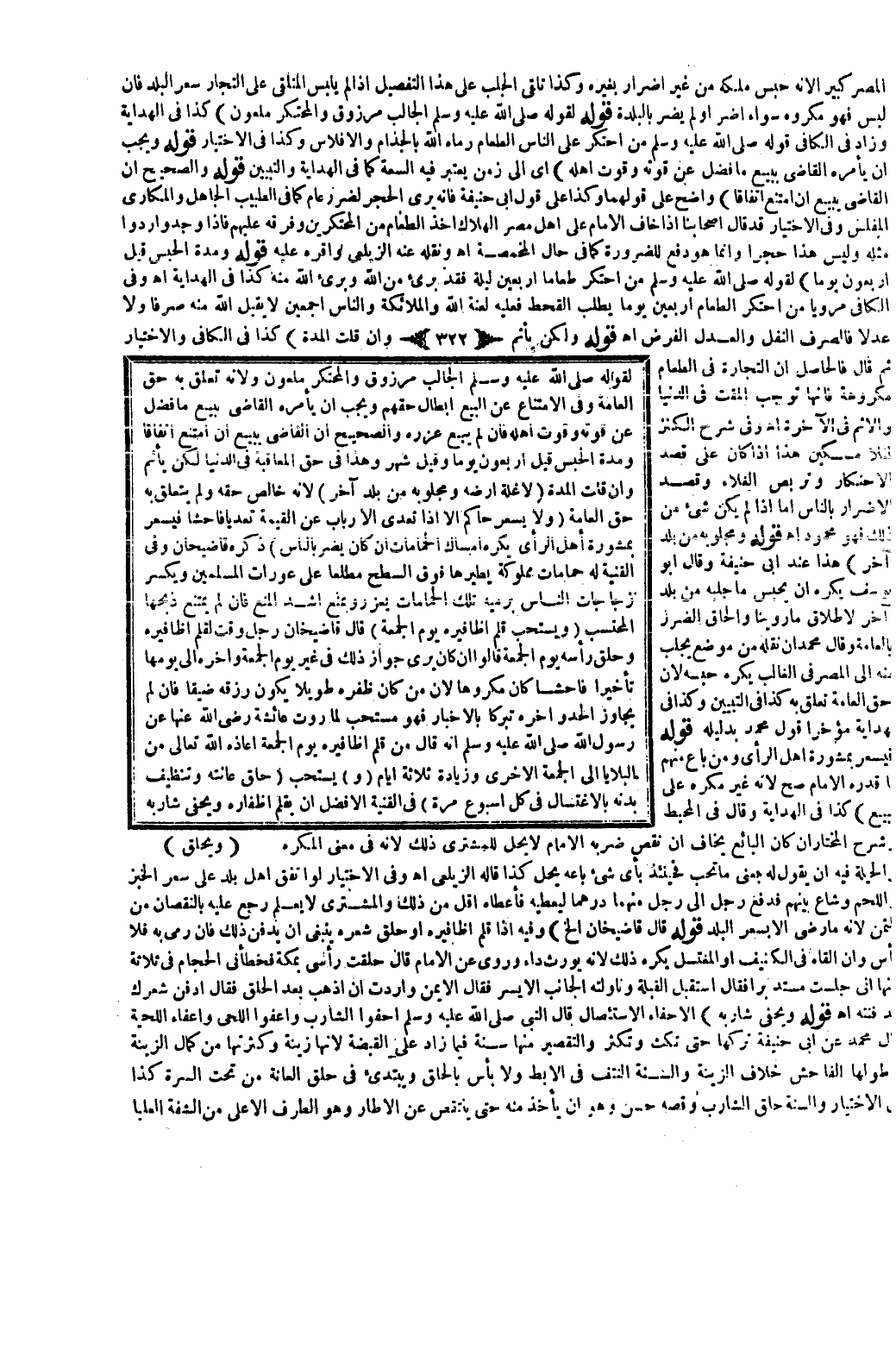 (قَوْلُهُ: لِقَوْلِهِ - صَلَّى اللَّهُ عَلَيْهِ وَسَلَّمَ - «الْجَالِبُ مَرْزُوقٌ وَالْمُحْتَكِرُ مَلْعُونٌ» ) كَذَا فِي الْهِدَايَةِ وَزَادَ فِي الْكَافِي قَوْلَهُ - صَلَّى اللَّهُ عَلَيْهِ وَسَلَّمَ - «مَنْ احْتَكَرَ عَلَى النَّاسِ الطَّعَامَ رَمَاهُ اللَّهُ بِالْجُذَامِ وَالْإِفْلَاسِ» وَكَذَا فِي الِاخْتِيَارِ.