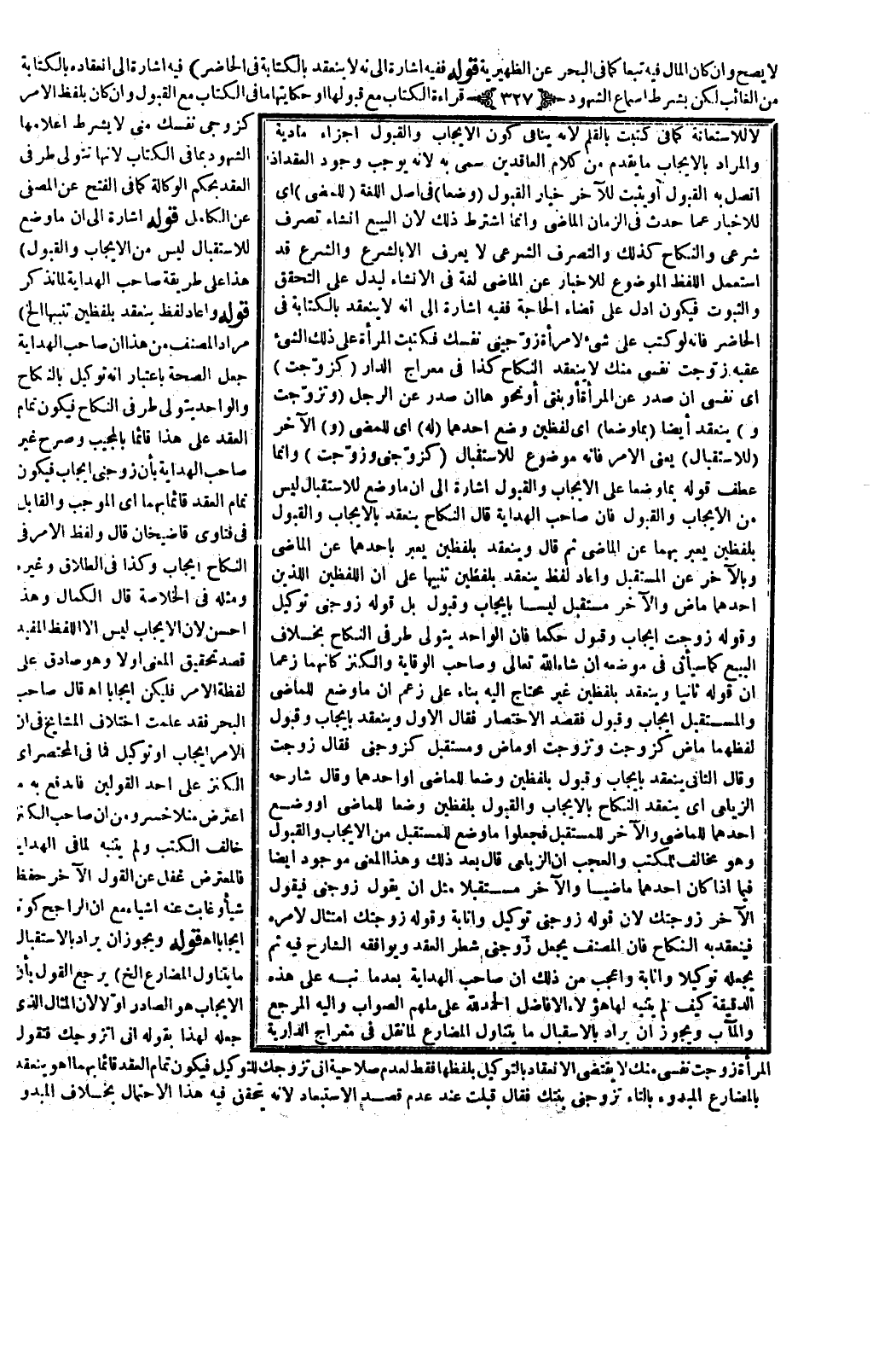 وَقَالَ شَارِحُهُ الزَّيْلَعِيُّ: أَيْ يَنْعَقِدُ النِّكَاحُ بِالْإِيجَابِ وَالْقَبُولِ بِلَفْظَيْنِ وُضِعَا لِلْمَاضِي أَوْ وُضِعَ أَحَدُهُمَا لِلْمَاضِي وَالْآخَرُ لِلْمُسْتَقْبَلِ فَجَعَلُوا مَا وُضِعَ لِلْمُسْتَقْبَلِ مِنْ الْإِيجَابِ وَالْقَبُولِ وَهُوَ مُخَالِفٌ لِلْكُتُبِ، وَالْعَجَبُ أَنَّ الزَّيْلَعِيَّ قَالَ بَعْدَ ذَلِكَ، وَهَذَا الْمَعْنَى مَوْجُودٌ أَيْضًا فِيمَا إذَا كَانَ أَحَدُهُمَا مَاضِيًا وَالْآخَرُ مُسْتَقْبَلًا، مِثْلُ أَنْ يَقُولَ زَوِّجْنِي فَيَقُولُ الْآخَرُ زَوَّجْتُكَ؛ لِأَنَّ قَوْلَهُ زَوِّجْنِي تَوْكِيلٌ وَإِنَابَةٌ، وَقَوْلُهُ زَوَّجْتُكَ امْتِثَالٌ لِأَمْرِهِ فَيَنْعَقِدُ بِهِ النِّكَاحُ فَإِنَّ الْمُصَنِّفَ يَجْعَلُ زَوِّجْنِي شَطْرَ الْعَقْدِ وَيُوَافِقُهُ الشَّارِحُ فِيهِ، ثُمَّ يَجْعَلُهُ تَوْكِيلًا وَإِنَابَةً وَأَعْجَبُ مِنْ ذَلِكَ أَنَّ صَاحِبَ الْهِدَايَةِ بَعْدَ مَا نَبَّهَ عَلَى هَذِهِ الدَّقِيقَةِ كَيْفَ لَمْ يَتَنَبَّهْ لَهَا هَؤُلَاءِ الْأَفَاضِلُ الْحَمْدُ لِلَّهِ عَلَى مُلْهِمِ الصَّوَابِ وَإِلَيْهِ الْمَرْجِعُ وَالْمَآبُ وَيَجُوزُ أَنْ يُرَادَ بِالِاسْتِقْبَالِ مَا يَتَنَاوَلُ الْمُضَارِعَ لِمَا نُقِلَ فِي مِعْرَاجِ الدِّرَايَةِ