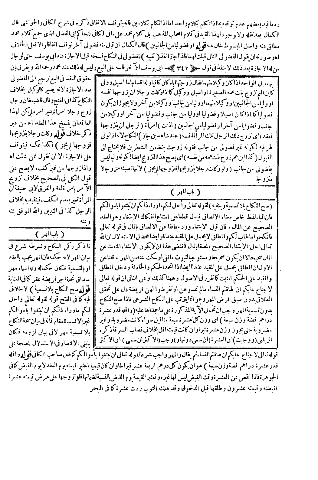 (قَوْلُهُ: لِقَوْلِهِ تَعَالَى {وَأُحِلَّ لَكُمْ مَا وَرَاءَ ذَلِكُمْ أَنْ تَبْتَغُوا بِأَمْوَالِكُمْ} [النساء: 24] غَيَّرَ الْأَنْسَبَ لِلْمَقَامِ فَإِنَّهُ فِي بَيَانِ صِحَّةِ النِّكَاحِ بِلَا تَسْمِيَةِ مَهْرٍ لَا فِي بَيَانِ لُزُومِهِ فَكَانَ يَنْبَغِي الِاقْتِصَارُ فِي الِاسْتِدْلَالِ لِلصِّحَّةِ عَلَى قَوْله تَعَالَى {لا جُنَاحَ عَلَيْكُمْ إِنْ طَلَّقْتُمُ النِّسَاءَ} [البقرة: 236] ، ثُمَّ يُقَالُ وَالْمَهْرُ وَاجِبٌ شَرْعًا لِقَوْلِهِ تَعَالَى {أَنْ تَبْتَغُوا بِأَمْوَالِكُمْ} [النساء: 24] كَمَا فَعَلَ صَاحِبُ الْكَافِي