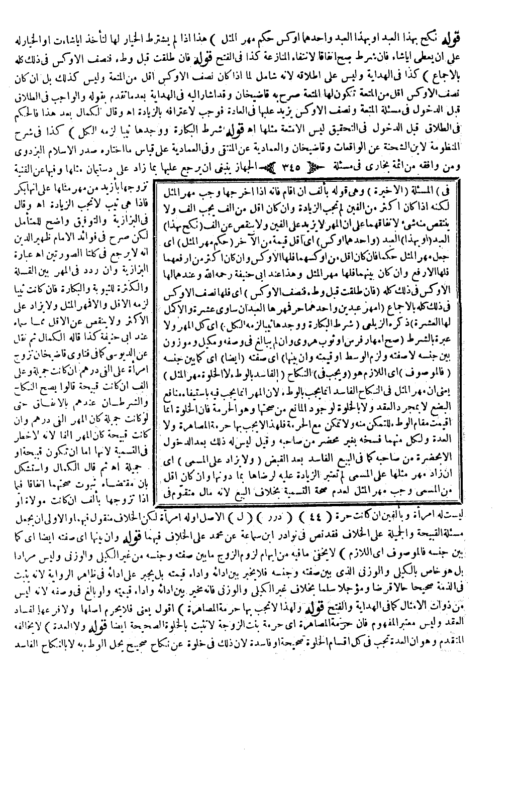وَفِي الْعِمَادِيَّةِ عَلَى قِيَاسِ مَا اخْتَارَهُ صَدْرُ الْإِسْلَامِ الْبَزْدَوِيُّ، وَمَنْ وَافَقَهُ مِنْ أَئِمَّةِ بُخَارَى فِي مَسْأَلَةِ الْجِهَارِ يَنْبَغِي أَنْ يَرْجِعَ عَلَيْهَا بِمَا زَادَ عَلَى دستيمان مِثْلِهَا وَفِيهَا عَنْ الْقُنْيَةِ تَزَوَّجَهَا بِأَزْيَدَ مِنْ مَهْرِ مِثْلِهَا عَلَى أَنَّهَا بِكْرٌ فَإِذَا هِيَ ثَيِّبٌ لَا تَجِبُ الزِّيَادَةُ اهـ. وَقَالَ فِي الْبَزَّازِيَّةِ وَالتَّوْفِيقُ وَاضِحٌ لِلْمُتَأَمِّلِ لَكِنْ صَرَّحَ فِي فَوَائِدِ الْإِمَامِ ظَهِيرِ الدِّينِ أَنَّهُ لَا يَرْجِعُ فِي كِلْتَا الصُّورَتَيْنِ اهـ. عِبَارَةُ الْبَزَّازِيَّةِ، وَإِنْ رَدَّدَ فِي الْمَهْرِ بَيْنَ الْقِلَّةِ وَالْكَثْرَةِ لِلثُّيُوبَةِ وَالْبَكَارَةِ فَإِنْ كَانَتْ ثَيِّبًا لَزِمَهُ الْأَقَلُّ وَإِلَّا فَمَهْرُ الْمِثْلِ وَلَا يُزَادُ عَلَى الْأَكْثَرِ وَلَا يَنْقُصُ عَنْ الْأَقَلِّ مِمَّا سَمَّاهُ عِنْدَ أَبِي حَنِيفَةَ، كَذَا قَالَهُ الْكَمَالُ، ثُمَّ نُقِلَ عَنْ الدَّبُوسِيِّ كَمَا فِي فَتَاوَى قَاضِي خَانْ تَزَوَّجَ امْرَأَةً عَلَى أَلْفَيْ دِرْهَمٍ إنْ كَانَتْ جَمِيلَةً وَعَلَى أَلْفٍ إنْ كَانَتْ قَبِيحَةً قَالُوا يَصِحُّ النِّكَاحُ وَالشَّرْطَانِ عِنْدَهُمْ بِالِاتِّفَاقِ حَتَّى لَوْ كَانَتْ جَمِيلَةً كَانَ الْمَهْرُ أَلْفَيْ دِرْهَمٍ، وَإِنْ كَانَتْ قَبِيحَةً كَانَ الْمَهْرُ أَلْفًا؛ لِأَنَّهُ لَا خَطَرَ فِي التَّسْمِيَةِ؛ لِأَنَّهَا إمَّا أَنْ تَكُونَ قَبِيحَةً أَوْ جَمِيلَةً اهـ. ثُمَّ قَالَ الْكَمَالُ وَاسْتَشْكَلَ بِأَنَّ مُقْتَضَاهُ ثُبُوتُ صِحَّتِهِمَا اتِّفَاقًا فِيمَا إذَا تَزَوَّجَهَا بِأَلْفٍ إنْ كَانَتْ مَوْلَاةً أَوْ لَيْسَتْ لَهُ امْرَأَةٌ وَبِأَلْفَيْنِ إنْ كَانَتْ حُرَّةَ الْأَصْلِ أَوْ لَهُ امْرَأَةٌ لَكِنَّ الْخِلَافَ مَنْقُولٌ فِيهِمَا وَالْأَوْلَى أَنْ يَجْعَلَ مَسْأَلَةَ الْقَبِيحَةِ وَالْجَمِيلَةِ عَلَى الْخِلَافِ فَقَدْ نَصَّ فِي نَوَادِرِ ابْنِ سِمَاعَةَ عَنْ مُحَمَّدٍ عَلَى الْخِلَافِ فِيهِمَا.