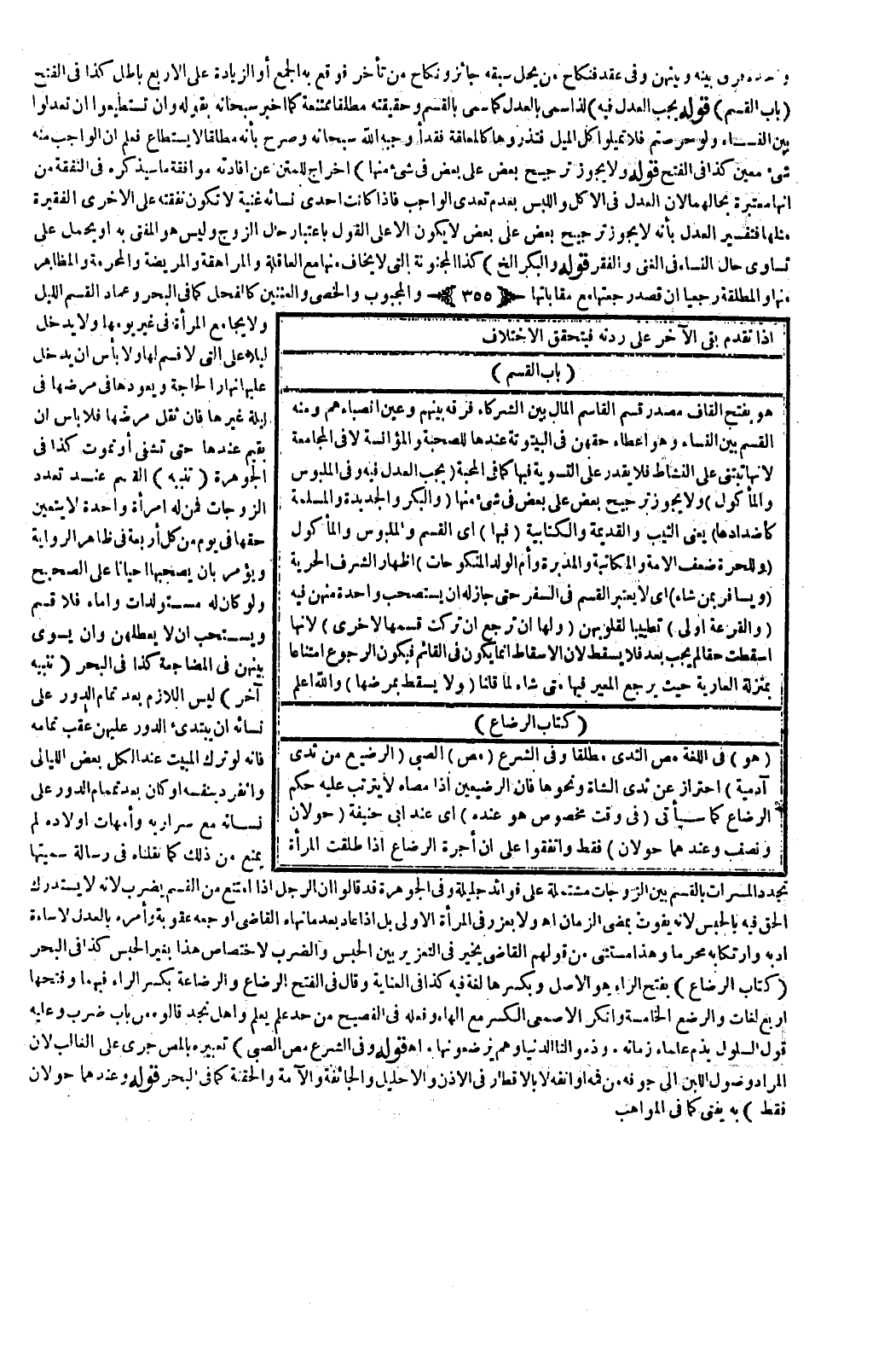 هُوَ بِفَتْحِ الْقَافِ مَصْدَرُ قَسَمَ الْقَاسِمُ الْمَالَ بَيْنَ الشُّرَكَاءِ فَرَّقَهُ بَيْنَهُمْ وَعَيَّنَ أَنْصِبَاءَهُمْ وَمِنْهُ الْقَسْمُ بَيْنَ النِّسَاءِ وَهُوَ إعْطَاءُ حَقِّهِنَّ فِي الْبَيْتُوتَةِ عِنْدَهَا لِلصُّحْبَةِ وَالْمُؤَانَسَةِ لَا فِي الْمُجَامَعَةِ؛ لِأَنَّهَا تُبْتَنَى عَلَى النَّشَاطِ فَلَا يَقْدِرُ عَلَى التَّسْوِيَةِ فِيهَا كَمَا فِي الْمَحَبَّةِ (يَجِبُ الْعَدْلُ فِيهِ وَفِي الْمَلْبُوسِ وَالْمَأْكُولِ) وَلَا يَجُوزُ تَرْجِيحُ بَعْضٍ عَلَى بَعْضٍ فِي شَيْءٍ مِنْهَا (وَالْبِكْرُ وَالْجَدِيدَةُ وَالْمُسْلِمَةُ كَأَضْدَادِهَا) يَعْنِي الثَّيِّبَ وَالْقَدِيمَةَ وَالْكِتَابِيَّةَ (فِيهَا) أَيْ الْقَسْمِ وَالْمَلْبُوسِ وَالْمَأْكُولِ (وَلِلْحُرَّةِ ضِعْفُ الْأَمَةِ وَالْمُكَاتَبَةِ وَالْمُدَبَّرَةِ وَأُمِّ الْوَلَدِ الْمَنْكُوحَاتِ) إظْهَارًا لِشَرَفِ الْحُرِّيَّةِ (وَيُسَافِرُ بِمَنْ شَاءَ) أَيْ لَا يُعْتَبَرُ الْقَسْمُ فِي السَّفَرِ حَتَّى جَازَ لَهُ أَنْ يَسْتَصْحِبَ وَاحِدَةً مِنْهُنَّ فِيهِ (وَالْقُرْعَةُ أَوْلَى) تَطْيِيبًا لِقُلُوبِهِنَّ (وَلَهَا أَنْ تَرْجِعَ إنْ تَرَكَتْ قَسْمَهَا لِأُخْرَى) ؛ لِأَنَّهَا أَسْقَطَتْ حَقًّا لَمْ يَجِبْ بَعْدُ فَلَا يَسْقُطُ؛ لِأَنَّ الْإِسْقَاطَ إنَّمَا يَكُونُ فِي الْقَائِمِ، فَيَكُونُ الرُّجُوعُ امْتِنَاعًا بِمَنْزِلَةِ الْعَارِيَّةِ حَيْثُ يَرْجِعُ الْمُعِيرُ فِيهَا مَتَى شَاءَ لِمَا قُلْنَا (وَلَا يَسْقُطُ بِمَرَضِهَا) وَاَللَّهُ أَعْلَمُ