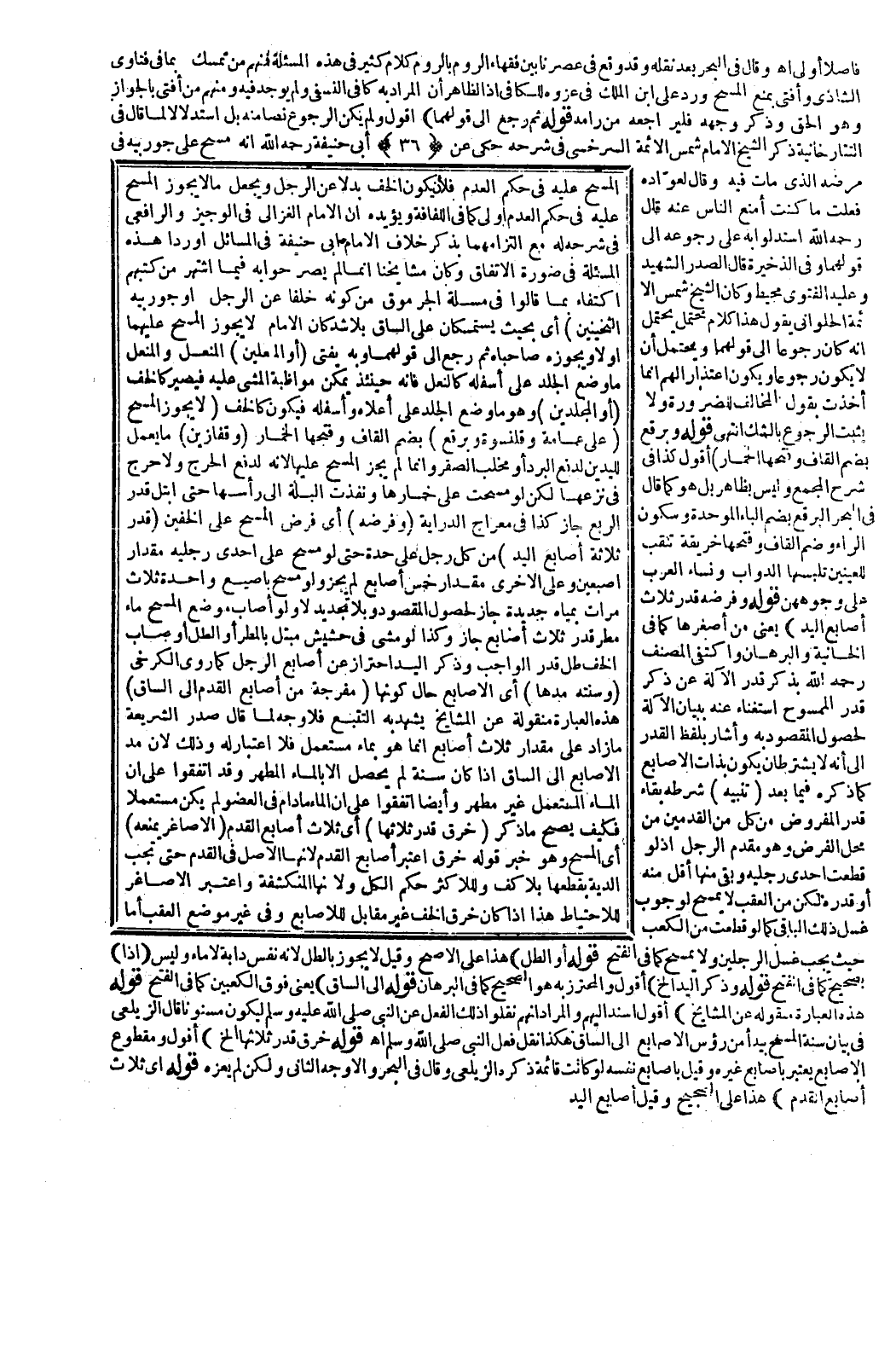 وَقَالَ فِي الْبَحْرِ بَعْدَ نَقْلِهِ: وَقَدْ وَقَعَ فِي عَصْرِنَا بَيْنَ فُقَهَاءِ الرُّومِ فِي الرُّومِ كَلَامٌ كَثِيرٌ فِي هَذِهِ الْمَسْأَلَةِ فَمِنْهُمْ مَنْ تَمَسَّكَ بِمَا فِي فَتَاوَى الشَّاذِيِّ وَأَفْتَى بِمَنْعِ الْمَسْحِ وَرَدَّ عَلَى ابْنِ الْمَلَكِ فِي عَزْوِهِ لِلْكَافِي إذْ الظَّاهِرُ أَنَّ الْمُرَادَ بِهِ كَافِي النَّسَفِيِّ وَلَمْ يُوجَدْ فِيهِ وَمِنْهُمْ مَنْ أَفْتَى بِالْجَوَازِ وَهُوَ الْحَقُّ وَذَكَرَ وَجْهَهُ فَلْيُرَاجِعْهُ مَنْ رَامَهُ (قَوْلُهُ: ثُمَّ رَجَعَ إلَى قَوْلِهِمَا) أَقُولُ وَلَمْ يَكُنْ الرُّجُوعُ نَصًّا مِنْهُ بَلْ اسْتِدْلَالًا لِمَا قَالَ فِي التَّتَارْخَانِيَّة ذَكَرَ الشَّيْخُ الْإِمَامُ شَمْسُ الْأَئِمَّةِ السَّرَخْسِيُّ فِي شَرْحِهِ حُكِيَ عَنْ أَبِي حَنِيفَةَ - رَحِمَهُ اللَّهُ - أَنَّهُ مَسَحَ عَلَى جَوْرَبَيْهِ فِي مَرَضِهِ الَّذِي مَاتَ فِيهِ، وَقَالَ لِعُوَّادِهِ فَعَلْت مَا كُنْت أَمْنَعُ النَّاسَ عَنْهُ قَالَ - رَحِمَهُ اللَّهُ - اسْتَدَلُّوا بِهِ عَلَى رُجُوعِهِ إلَى قَوْلِهِمَا.