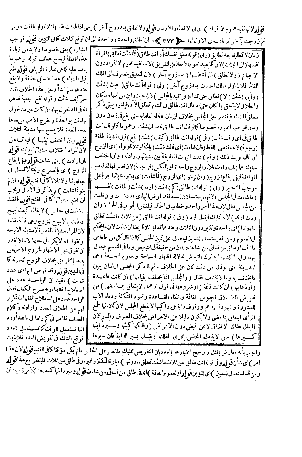 ثُمَّ لَمَّا ذَكَرَ الْمَجْلِسَ أَرَادَ أَنْ يُبَيِّنَ مَا يَخْتَلِفُ بِهِ وَمَا لَا يَخْتَلِفُ فَقَالَ (وَالْمَجْلِسُ إنَّمَا يَخْتَلِفُ بِقِيَامِهَا) إنْ كَانَتْ قَاعِدَةً (أَوْ ذَهَابِهَا) إنْ كَانَتْ قَائِمَةً (أَوْ شُرُوعِهَا فِي قَوْلٍ، أَوْ عَمَلٍ لَا يَتَعَلَّقُ بِمَا مَضَى) مِنْ تَفْوِيضِ الطَّلَاقِ، فَجُلُوسُ الْقَائِمَةِ، وَاتِّكَاءُ الْقَاعِدَةِ، وَقُعُودُ الْمُتَّكِئَةِ، وَدُعَاءُ الْأَبِ لِلْمَشُورَةِ وَشُهُودٍ تُشْهِدُهُمْ، وَوَقْفُ دَابَّةٍ - هِيَ رَاكِبَتُهَا - لَا يَقْطَعُ الْمَجْلِسَ لِأَنَّ كُلًّا مِنْهَا لِجَمْعِ الرَّأْيِ فَيَتَعَلَّقُ بِمَا مَضَى وَلَا يَكُونُ دَلِيلًا عَلَى الْإِعْرَاضِ بِخِلَافِ الصَّرْفِ وَالسَّلَمِ لِأَنَّ الْمُبْطِلَ هُنَاكَ الِافْتِرَاقُ لَا عَنْ قَبْضٍ دُونَ الْإِعْرَاضِ (وَفُلْكُهَا كَبَيْتِهَا، وَسَيْرُ دَابَّتِهَا كَسَيْرِهَا) حَتَّى لَا يَتَبَدَّلَ الْمَجْلِسُ بِجَرْيِ الْفُلْكِ، وَيَتَبَدَّلُ بِسَيْرِ الدَّابَّةِ فَإِنَّ سَيْرَهَا