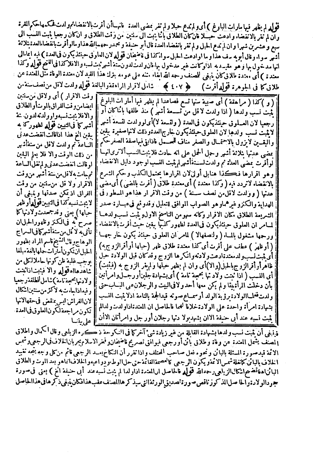 (وَكَذَا مُعْتَدَّةٌ) أَيْ مُعْتَدَّةُ طَلَاقٍ (أَقَرَّتْ بِالْمُضِيِّ) أَيْ مُضِيِّ عِدَّتِهَا (وَوَلَدَتْ لِأَقَلَّ مِنْ نِصْفِ سَنَةٍ) مِنْ وَقْتِ الْإِقْرَارِ هَذَا هُوَ الْمَسْطُورُ فِي الْهِدَايَةِ وَالْكَنْزِ وَغَيْرِهِمَا وَهُوَ الصَّوَابُ الْمُوَافِقُ لِلتَّعْلِيلِ وَقَدْ وَقَعَ فِي عِبَارَةِ صَدْرِ الشَّرِيعَةِ الطَّلَاقُ مَكَانَ الْإِقْرَارِ وَكَأَنَّهُ سَهْوٌ مِنْ النَّاسِخِ الْأَوَّلِ وَيَثْبُتُ نَسَبُ وَلَدِهَا لِمَا مَرَّ أَنَّ الْعُلُوقَ حِينَئِذٍ يَكُونُ فِي الْعِدَّةِ لِظُهُورِ كَذِبِهَا بِيَقِينٍ حَيْثُ أَقَرَّتْ بِالِانْقِضَاءِ وَرَحِمُهَا مَشْغُولٌ بِالْمَاءِ (وَلِنِصْفِهَا لَا لِمَا مَرَّ أَنَّ الْعُلُوقَ حِينَئِذٍ يَكُونُ خَارِجَهَا) (أَوْ ظَهَرَ) عَطْفٌ عَلَى أَقَرَّتْ أَيْ كَذَا مُعْتَدَّةُ طَلَاقٍ ظَهَرَ (حَبَلُهَا، أَوْ أَقَرَّ الزَّوْجُ بِهِ) أَيْ يَثْبُتُ نَسَبُ وَلَدِ مُعْتَدَّةٍ ادَّعَتْ وِلَادَتَهُ وَأَنْكَرَهَا الزَّوْجُ وَقَدْ كَانَ قَبْلَ الْوِلَادَةِ حَبَلٌ ظَاهِرٌ، أَوْ أَقَرَّ الزَّوْجُ بِالْحَبَلِ (وَإِلَّا) أَيْ، وَإِنْ لَمْ يَظْهَرْ حَبَلُهَا وَلَمْ يُقِرَّ الزَّوْجُ بِهِ (فَيَثْبُتُ) أَيْ النَّسَبُ (إذَا ثَبَتَتْ وِلَادَتُهَا بِحُجَّةٍ تَامَّةٍ) أَيْ بِشَهَادَةِ رَجُلَيْنِ، أَوْ رَجُلٍ وَامْرَأَتَيْنِ بِأَنْ دَخَلَتْ الْمَرْأَةُ بَيْتًا وَلَمْ يَكُنْ مَعَهَا أَحَدٌ وَلَا فِي الْبَيْتِ، وَالرَّجُلَانِ عَلَى الْبَابِ حَتَّى وَلَدَتْ فَعَلِمَا الْوِلَادَةَ بِرُؤْيَةِ الْوَلَدِ، أَوْ سَمَاعِ صَوْتِهِ قَيَّدَ الْحُجَّةَ بِالتَّامَّةِ؛ إذْ لَا يَثْبُتُ النَّسَبُ بِشَهَادَةِ امْرَأَةٍ وَاحِدَةٍ عَلَى الْوِلَادَةِ خِلَافًا لَهُمَا فَالْحَاصِلُ أَنَّ الْمُعْتَدَّةَ إذَا وَلَدَتْ وَلَدًا لَمْ يَثْبُتْ نَسَبُهُ عِنْدَ أَبِي حَنِيفَةَ إلَّا أَنْ يَشْهَدَ بِوِلَادَتِهَا رَجُلَانِ، أَوْ رَجُلٌ وَامْرَأَتَانِ إلَّا أَنْ