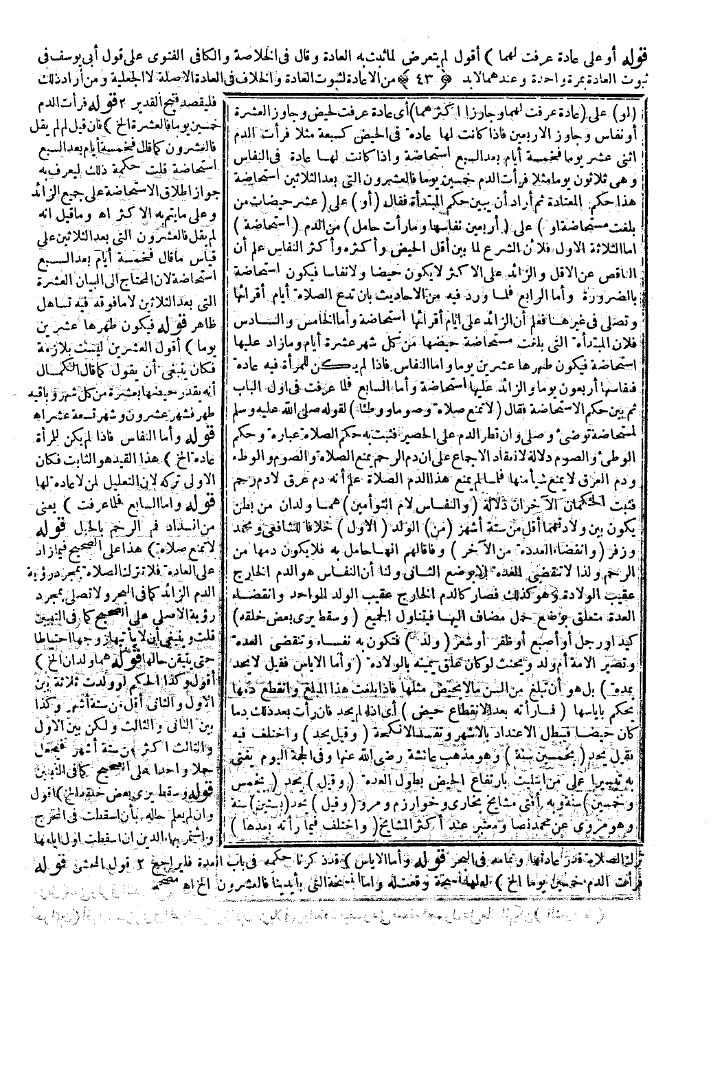 (أَوْ) عَلَى (عَادَةٍ عُرِفَتْ لَهُمَا وَجَاوَزَا أَكْثَرَهُمَا) أَيْ عَادَةٍ عُرِفَتْ لِحَيْضٍ وَجَاوَزَ الْعَشَرَةَ أَوْ نِفَاسٍ وَجَاوَزَ الْأَرْبَعِينَ فَإِذَا كَانَتْ لَهَا عَادَةٌ فِي الْحَيْضِ كَسَبْعَةٍ مَثَلًا فَرَأَتْ الدَّمَ اثْنَيْ عَشَرَ يَوْمًا فَخَمْسَةُ أَيَّامٍ بَعْدَ السَّبْعِ اسْتِحَاضَةٌ، وَإِذَا كَانَتْ لَهَا عَادَةٌ فِي النِّفَاسِ وَهِيَ ثَلَاثُونَ يَوْمًا مَثَلًا فَرَأَتْ الدَّمَ خَمْسِينَ يَوْمًا فَالْعِشْرُونَ الَّتِي بَعْدَ الثَّلَاثِينَ اسْتِحَاضَةٌ هَذَا حُكْمُ الْمُعْتَادَةِ ثُمَّ أَرَادَ أَنْ يُبَيِّنَ حُكْمَ الْمُبْتَدَأَةِ فَقَالَ (أَوْ) عَلَى (عَشَرَةِ حَيْضٍ مَنْ بَلَغَتْ مُسْتَحَاضَةً أَوْ) عَلَى (أَرْبَعِينَ نِفَاسِهَا وَمَا رَأَتْ حَامِلٌ) مِنْ الدَّمِ (اسْتِحَاضَةٌ) أَمَّا الثَّلَاثَةُ الْأُوَلُ فَلِأَنَّ الشَّرْعَ لَمَّا بَيَّنَ أَقَلَّ الْحَيْضِ وَأَكْثَرَهُ وَأَكْثَرَ النِّفَاسِ عُلِمَ أَنَّ النَّاقِصَ عَنْ الْأَقَلِّ، وَالزَّائِدَ عَلَى الْأَكْثَرِ لَا يَكُونُ حَيْضًا وَلَا نِفَاسًا فَيَكُونُ اسْتِحَاضَةً بِالضَّرُورَةِ، وَأَمَّا الرَّابِعُ فَلِمَا وَرَدَ فِيهِ مِنْ الْأَحَادِيثِ بِأَنْ تَدَعَ الصَّلَاةَ أَيَّامَ أَقْرَائِهَا وَتُصَلِّيَ فِي غَيْرِهَا فَعُلِمَ أَنَّ الزَّائِدَ عَلَى أَيَّامِ أَقْرَائِهَا اسْتِحَاضَةٌ، وَأَمَّا الْخَامِسُ وَالسَّادِسُ فَلِأَنَّ الْمُبْتَدِئَةَ الَّتِي بَلَغَتْ مُسْتَحَاضَةً حَيْضُهَا مِنْ كُلِّ شَهْرٍ عَشَرَةُ أَيَّامٍ وَمَا زَادَ عَلَيْهَا اسْتِحَاضَةٌ فَيَكُونُ طُهْرُهَا عِشْرِينَ يَوْمًا وَأَمَّا النِّفَاسُ فَإِذَا لَمْ يَكُنْ لِلْمَرْأَةِ فِيهِ عَادَةٌ فَنِفَاسُهَا أَرْبَعُونَ يَوْمًا وَالزَّائِدُ عَلَيْهَا اسْتِحَاضَةٌ.