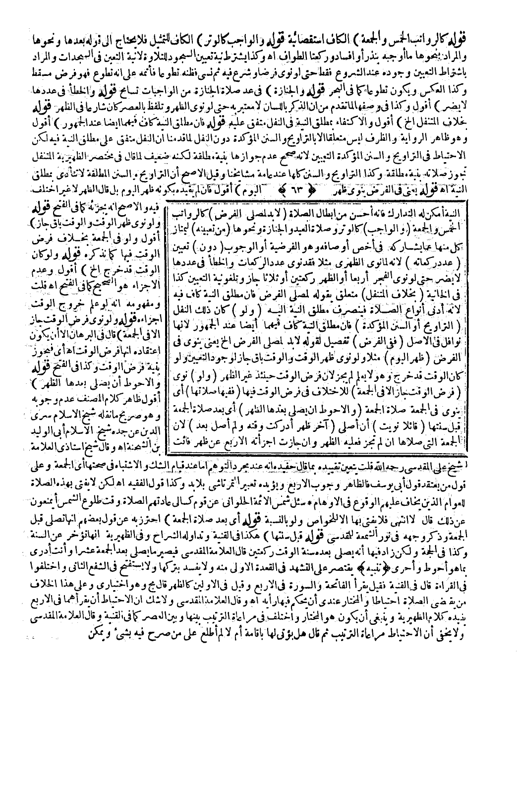 وَقَالَ شَيْخُ أُسْتَاذِي الْعَلَّامَةُ الشَّيْخُ عَلِيٌّ الْمَقْدِسِيُّ - رَحِمَهُ اللَّهُ - قُلْت يَتَعَيَّنُ تَقْيِيدُهُ بِمَا قَالَ حَفِيدُهُ أَنَّهُ عِنْدَ مُجَرَّدِ التَّوَهُّمِ أَمَّا عِنْدَ قِيَامِ الشَّكِّ وَالِاشْتِبَاهِ فِي صِحَّتِهَا أَيْ الْجُمُعَةِ وَعَلَى قَوْلِ مَنْ يَعْتَقِدُ قَوْلَ أَبِي يُوسُفَ فَالظَّاهِرُ وُجُوبُ الْأَرْبَعِ وَيُؤَيِّدُهُ تَعْبِيرُ التُّمُرْتَاشِيِّ بِلَا بُدَّ، وَكَذَا قَوْلُ الْفَقِيهِ اهـ. لَكِنْ لَا يُفْتَى بِهَذِهِ الصَّلَاةِ لِلْعَوَامِّ الَّذِينَ يُخَافُ عَلَيْهِمْ الْوُقُوعُ فِي الْأَوْهَامِ سُئِلَ شَمْسُ الْأَئِمَّةِ الْحَلْوَانِيُّ عَنْ قَوْمٍ كُسَالَى عَادَتُهُمْ الصَّلَاةُ وَقْتَ طُلُوعِ الشَّمْسِ أَيُمْنَعُونَ عَنْ ذَلِكَ قَالَ لَا انْتَهَى فَلَا يُفْتَى بِهَا إلَّا لِلْخَوَاصِّ، وَلَوْ بِالنِّسْبَةِ.