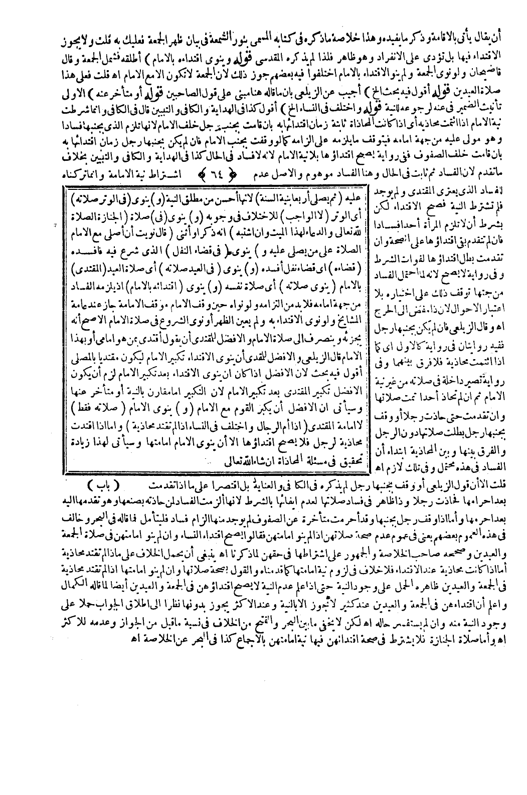قُلْت إلَّا أَنَّ قَوْلَ الزَّيْلَعِيِّ أَوْ وَقَفَ بِجَنْبِهَا رَجُلٌ لَمْ يَذْكُرْهُ فِي الْكَافِي وَالْعِنَايَةِ بَلْ اقْتَصَرَا عَلَى مَا إذَا تَقَدَّمَتْ بَعْدَ إحْرَامِهَا فَحَاذَتْ رَجُلًا وَذَا ظَاهِرٌ فِي فَسَادِ صَلَاتِهَا لِعَدَمِ إيفَائِهَا بِالشَّرْطِ؛ لِأَنَّهَا أَلْزَمَتْ الْفَسَادَ لِمَنْ حَاذَتْهُ بِصُنْعِهَا وَهُوَ تَقَدُّمُهَا إلَيْهِ بَعْدَ إحْرَامِهَا. وَأَمَّا إذَا وَقَفَ رَجُلٌ بِجَنْبِهَا، وَقَدْ أَحْرَمَتْ مُتَأَخِّرَةً عَنْ الصُّفُوفِ لَمْ يُوجَدْ مِنْهَا إلْزَامُ فَسَادٍ فَلْيُتَأَمَّلْ فَمَا قَالَهُ فِي الْبَحْرِ وَخَالَفَ فِي هَذَا الْعُمُومِ بَعْضُهُمْ يَعْنِي فِي عُمُومِ عَدَمِ صِحَّةِ صَلَاتِهِنَّ إذَا لَمْ يَنْوِ إمَامَتَهُنَّ فَقَالُوا يَصِحُّ اقْتِدَاءُ النِّسَاءِ، وَإِنْ لَمْ يَنْوِ إمَامَتَهُنَّ فِي صَلَاةِ الْجُمُعَةِ وَالْعِيدَيْنِ وَصَحَّحَهُ صَاحِبُ الْخُلَاصَةِ وَالْجُمْهُورُ عَلَى اشْتِرَاطِهَا فِي حَقِّهِنَّ لِمَا ذَكَرْنَا اهـ. يَنْبَغِي أَنْ يُحْمَلَ الْخِلَافُ عَلَى مَا إذَا لَمْ تَقْتَدِ مُحَاذِيَةٌ أَمَّا إذَا كَانَتْ مُحَاذِيَةً عِنْدَ الِاقْتِدَاءِ فَلَا خِلَافَ فِي لُزُومِ نِيَّةِ إمَامَتِهَا كَمَا قَدَّمْنَاهُ، وَالْقَوْلُ بِصِحَّةِ صَلَاتِهَا وَإِنْ لَمْ يَنْوِ إمَامَتَهَا إذَا لَمْ تَقْتَدِ مُحَاذِيَةٌ فِي الْجُمُعَةِ وَالْعِيدَيْنِ ظَاهِرُهُ الْحَمْلُ عَلَى وُجُودِ النِّيَّةِ حَتَّى إذَا عُلِمَ عَدَمُ النِّيَّةِ لَا يَصِحُّ اقْتِدَاؤُهُنَّ فِي الْجُمُعَةِ وَالْعِيدَيْنِ أَيْضًا لِمَا قَالَهُ الْكَمَالُ وَاعْلَمْ أَنَّ اقْتِدَاءَهُنَّ فِي الْجُمُعَةِ وَالْعِيدَيْنِ عِنْدَ كَثِيرٍ لَا تَجُوزُ إلَّا بِالنِّيَّةِ وَعِنْدَ الْأَكْثَرِ يَجُوزُ بِدُونِهَا نَظَرًا إلَى إطْلَاقِ الْجَوَابِ حَمْلًا عَلَى وُجُودِ النِّيَّةِ مِنْهُ، وَإِنْ لَمْ يُسْتَفْسَرْ حَالُهُ اهـ. لَكِنْ لَا يَخْفَى مَا بَيْنَ الْبَحْرِ وَالْفَتْحِ مِنْ الْخِلَافِ فِي نِسْبَةِ مَا قِيلَ مِنْ الْجَوَازِ وَعَدَمِهِ لِلْأَكْثَرِ اهـ.