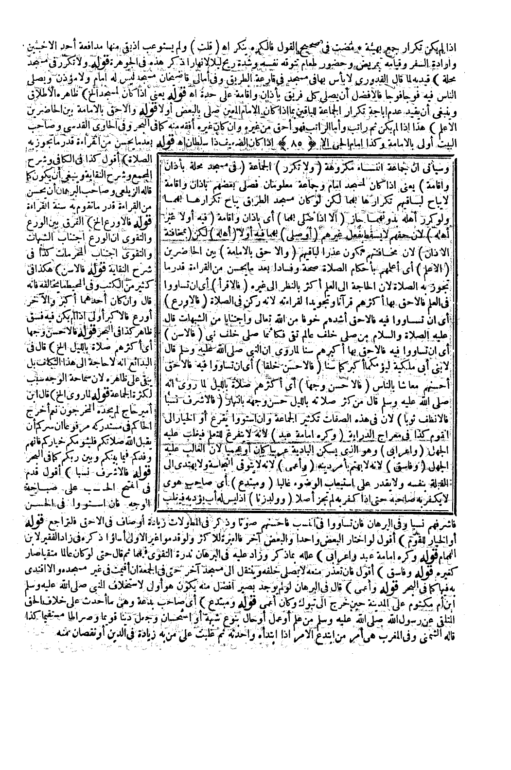 (قَوْلُهُ وَلَا تُكَرَّرُ فِي مَسْجِدِ مَحَلَّةٍ) قَيَّدَ بِهِ لِمَا قَالَ الْقُدُورِيُّ لَا بَأْسَ بِهَا فِي مَسْجِدٍ فِي قَارِعَةِ الطَّرِيقِ.