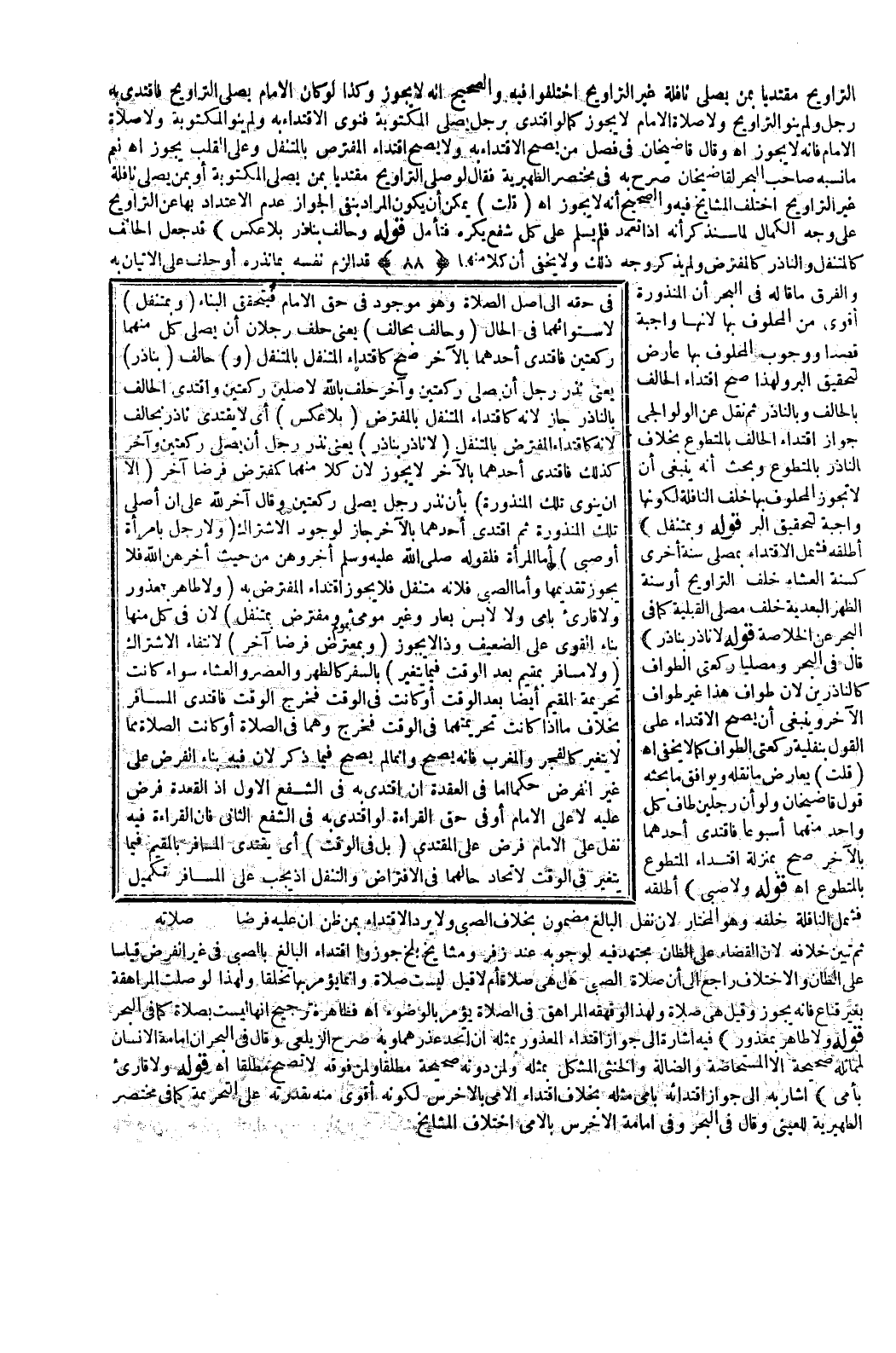 وَقَالَ قَاضِي خَانْ فِي فَصْلِ مَنْ يَصِحُّ الِاقْتِدَاءُ بِهِ وَلَا يَصِحُّ اقْتِدَاءُ الْمُفْتَرِصِ بِالْمُتَنَفِّلِ وَعَلَى الْقَلْبِ يَجُوزُ اهـ نَعَمْ مَا نَسَبَهُ صَاحِبُ الْبَحْرِ لِقَاضِي خَانْ صَرَّحَ بِهِ فِي مُخْتَصَرِ الظَّهِيرِيَّةِ فَقَالَ لَوْ صَلَّى التَّرَاوِيحَ مُقْتَدِيًا بِمَنْ يُصَلِّي الْمَكْتُوبَةَ أَوْ بِمَنْ يُصَلِّي نَافِلَةً غَيْرَ التَّرَاوِيحِ اخْتَلَفَ الْمَشَايِخُ فِيهِ وَالصَّحِيحُ أَنَّهُ لَا يَجُوزُ اهـ قُلْت يُمْكِنُ أَنْ يَكُونَ الْمُرَادُ بِنَفْيِ الْجَوَازِ عَدَمَ الِاعْتِدَادِ بِهَا عَنْ التَّرَاوِيحِ عَلَى وَجْهِ الْكَمَالِ لِمَا سَنَذْكُرُ أَنَّهُ إذَا تَعَمَّدَ فَلَمْ يُسَلِّمْ عَلَى كُلِّ شَفْعٍ يُكْرَهُ فَتَأَمَّلْ.