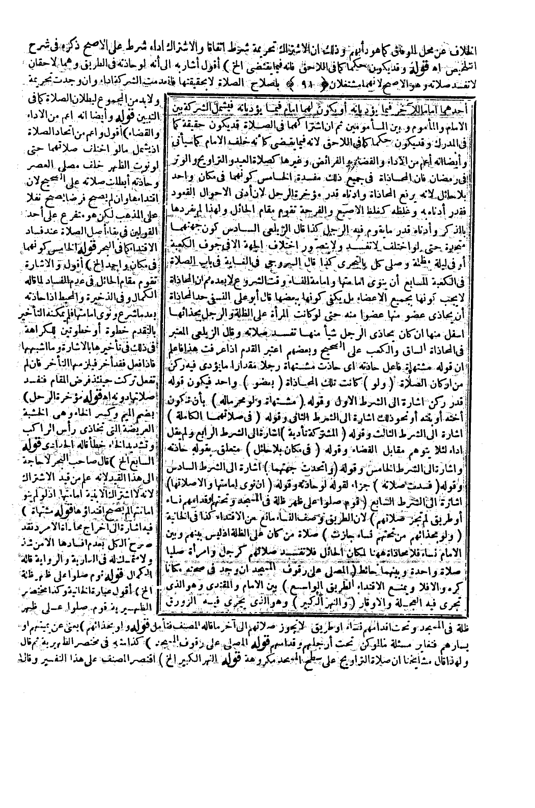 أَحَدُهُمَا إمَامًا لِلْآخَرِ فِيمَا يُؤَدِّيَانِهِ أَوْ يَكُونَ لَهُمَا إمَامٌ فِيمَا يُؤَدِّيَانِهِ فَيَشْمَلُ الشَّرِكَةَ بَيْنَ الْإِمَامِ وَالْمَأْمُومِ وَبَيْنَ الْمَأْمُومِينَ ثُمَّ إنَّ اشْتِرَاكَهُمَا فِي الصَّلَاةِ قَدْ يَكُونُ حَقِيقَةً كَمَا فِي الْمُدْرِكِ، وَقَدْ يَكُونُ حُكْمًا كَمَا فِي اللَّاحِقِ؛ لِأَنَّهُ فِيمَا يَقْتَضِي كَأَنَّهُ خَلْفَ الْإِمَامِ كَمَا سَيَأْتِي وَأَيْضًا إنَّهُ أَعَمُّ مِنْ الْأَدَاءِ وَالْقَضَاءِ وَالْفَرَائِضِ وَغَيْرِهَا كَصَلَاةِ الْعِيدِ وَالتَّرَاوِيحِ وَالْوِتْرِ فِي رَمَضَانَ فَإِنَّ الْمُحَاذَاةَ فِي جَمِيعِ ذَلِكَ مُفْسِدَةٌ. الْخَامِسُ كَوْنُهُمَا فِي مَكَان وَاحِدٍ بِلَا حَائِلٍ؛ لِأَنَّهُ يَرْفَعُ الْمُحَاذَاةَ وَأَدْنَاهُ قَدْرُ مُؤْخِرَةِ الرَّحْلِ؛ لِأَنَّ أَدْنَى الْأَحْوَالِ الْقُعُودُ فَقُدِّرَ أَدْنَاهُ بِهِ وَغِلَظُهُ كَغِلَظِ الْإِصْبَعِ وَالْفُرْجَةُ تَقُومُ مَقَامَ الْحَائِلِ وَلِهَذَا لَمْ يُفْرِدْهَا بِالذِّكْرِ وَأَدْنَاهُ قَدْرُ مَا يَقُومُ فِيهِ الرَّجُلُ، كَذَا قَالَ الزَّيْلَعِيُّ. السَّادِسُ كَوْنُ جِهَتِهِمَا مُتَّحِدَةً حَتَّى لَوْ اخْتَلَفَتْ لَا تُفْسِدُ وَلَا يُتَصَوَّرُ اخْتِلَافُ الْجِهَةِ إلَّا فِي جَوْفِ الْكَعْبَةِ أَوْ فِي لَيْلَةٍ مُظْلِمَةٍ وَصَلَّى كُلٌّ بِالتَّحَرِّي كَذَا قَالَ السُّرُوجِيُّ فِي الْغَايَةِ فِي بَابِ الصَّلَاةِ فِي الْكَعْبَةِ. السَّابِعُ أَنْ يَنْوِيَ إمَامَتَهَا وَإِمَامَةَ النِّسَاءِ وَقْتَ الشُّرُوعِ لَا بَعْدَهُ ثُمَّ إنَّ الْمُحَاذَاةَ لَا يَجِبُ كَوْنُهَا بِجَمِيعِ الْأَعْضَاءِ بَلْ يَكْفِي كَوْنُهَا بِبَعْضِهَا قَالَ أَبُو عَلِيٍّ النَّسَفِيُّ حَدُّ الْمُحَاذَاةِ أَنْ يُحَاذِيَ عُضْوٌ مِنْهَا عُضْوًا مِنْهُ حَتَّى لَوْ كَانَتْ الْمَرْأَةُ عَلَى الظُّلَّةِ وَالرَّجُلُ بِحِذَائِهَا أَسْفَلُ مِنْهَا إنْ كَانَ يُحَاذِي الرَّجُلُ شَيْئًا مِنْهَا تَفْسُدُ صَلَاتُهُ، وَقَالَ الزَّيْلَعِيُّ الْمُعْتَبَرُ فِي الْمُحَاذَاةِ السَّاقُ وَالْكَعْبُ عَلَى الصَّحِيحِ وَبَعْضُهُمْ اعْتَبَرَ الْقَدَمَ إذَا عَرَفْت هَذَا فَاعْلَمْ أَنَّ قَوْلَهُ مُشْتَهَاةٌ فَاعِلُ حَاذَتْهُ أَيْ حَاذَتْ مُشْتَهَاةٌ رَجُلًا مِقْدَارَ مَا يُؤَدَّى فِيهِ رُكْنٌ مِنْ أَرْكَانِ الصَّلَاةِ (وَلَوْ) كَانَتْ تِلْكَ الْمُحَاذَاةُ (بِعُضْوٍ) وَاحِدٍ فَيَكُونُ قَوْلُهُ قَدْرَ رُكْنٍ إشَارَةً إلَى الشَّرْطِ الْأَوَّلِ. وَقَوْلُهُ (مُشْتَهَاةً، وَلَوْ مَحْرَمًا لَهُ) بِأَنْ تَكُونَ أُخْتَهُ أَوْ بِنْتَه أَوْ نَحْوَ ذَلِكَ إشَارَةٌ إلَى الشَّرْطِ الثَّانِي. وَقَوْلُهُ (فِي صَلَاتِهِمَا الْكَامِلَةِ) إشَارَةٌ إلَى الشَّرْطِ الثَّالِثِ. وَقَوْلُهُ (الْمُشْتَرَكَةُ تَأْدِيَةً) إشَارَةٌ إلَى الشَّرْطِ الرَّابِعِ وَلَمْ يَقُلْ أَدَاءً لِئَلَّا يُتَوَهَّمَ مُقَابِلُ الْقَضَاءِ. وَقَوْلُهُ (فِي مَكَان بِلَا حَائِلٍ) مُتَعَلِّقٌ بِقَوْلِهِ حَاذَتْهُ وَإِشَارَةٌ إلَى الشَّرْطِ الْخَامِسِ. وَقَوْلُهُ (وَاتَّحَدَتْ جِهَتُهُمَا) إشَارَةٌ إلَى الشَّرْطِ السَّادِسِ. وَقَوْلُهُ (فَسَدَتْ صَلَاتُهُ) جَزَاءً لِقَوْلِهِ لَوْ حَاذَتْهُ. وَقَوْلُهُ (إنْ نَوَى إمَامَتَهَا وَإِلَّا صَلَاتَهَا) إشَارَةٌ إلَى الشَّرْطِ السَّابِعِ.