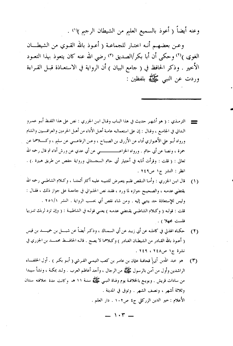 (¬2) حكاه الهذلي في كامله عن أبي زيد عن أبي السماك، وذكر أيضاً عن شبل بن حميد بن قيس (أعوذ بالله القادر من الشيطان الغادر) وكلاهما لا يصح. قاله الحافظ محمد بن الجزري في نشرة ج 1 ص 248، 249.