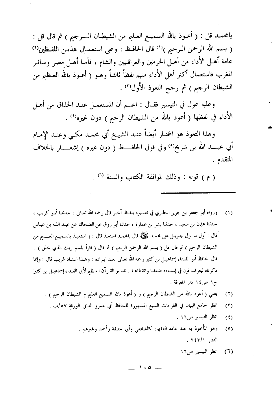 يا محمد قل: (أعوذ بالله السميع العليم من الشيطان الرجيم) ثم قال قل: (بِسْمِ اللَّهِ الرَّحْمَنِ الرَّحِيمِ) (¬1) قال الحافظ: وعلى استعمال هذين اللفظين (¬2) عامة أهل الأداء من أهل الحرفين والعراقيين والشام، فأما أهل مصر وسائر المغرب فاستعمال أكثر أهل الأداء منهم لفظاً ثالثاً وهو (أعوذ بالله العظيم من الشيطان الرجيم) ثم رجح التعوذ الأول (¬3).