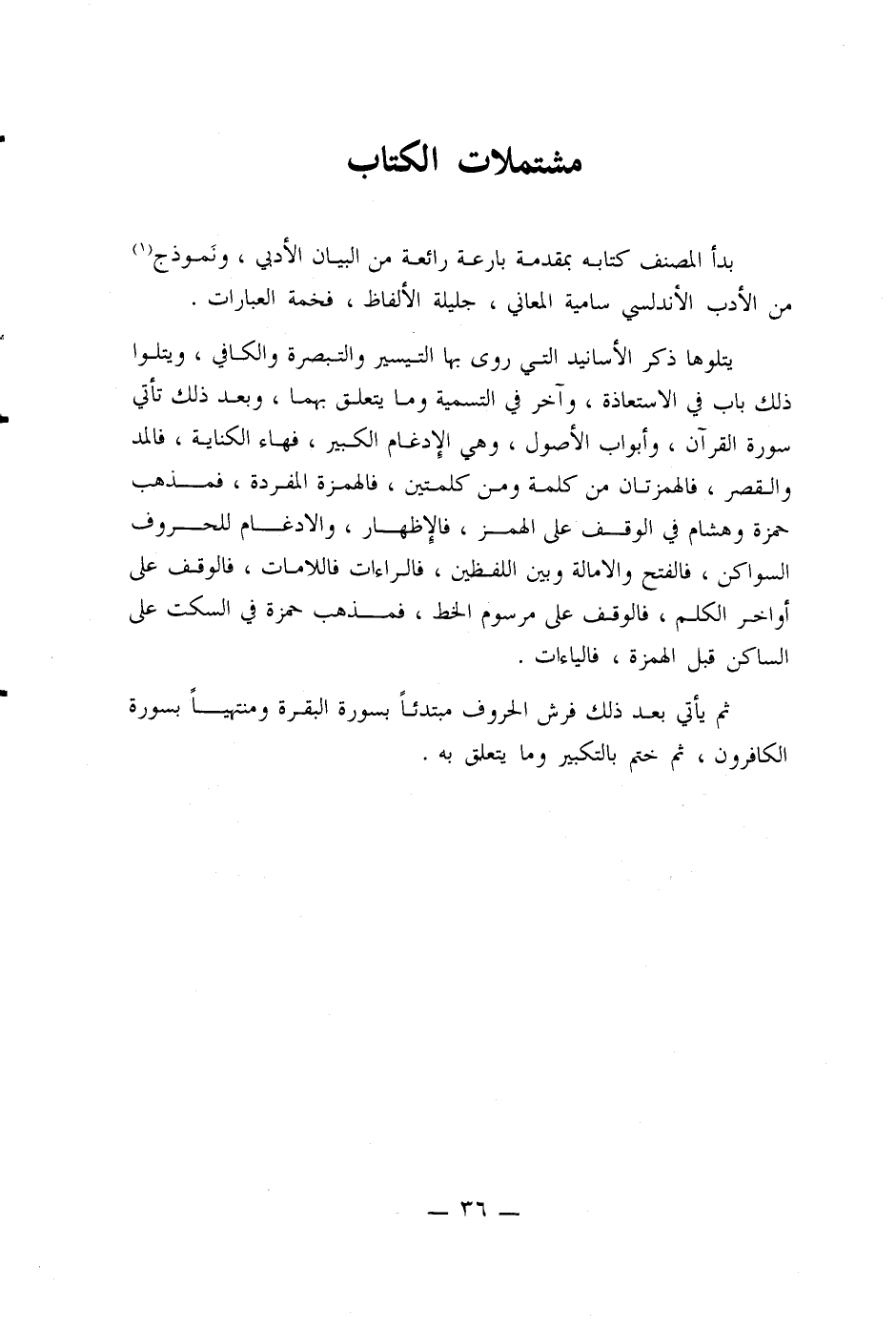 يتلوها ذكر الأسانيد التي روى بها التيسير والتبصرة والكافي، ويتلوا ذلك باب في الإستعاذة، وآخر في التسمية وما يتعلق بهما، وبعد ذلك تأتي سورة القرآن، وأبواب الأصول، وهي الإدغام الكبير، فهاء الكناية، فالمد والقصر، فالهمزتان من كلمة ومن كلمتين، فالهمزة الفردة، فمذهب حمزة وهشام في الوقف على الهمز، فالإِظهار، والإدغام للحروف السواكن، فالفتح والإمالة وبين اللفظين، فالراءات فاللامات، فالوقف على أواخر الكلم، فالوقف على مرسوم الخط، فمذهب حمزة في السكت على الساكن قبل الهمزة، فالياءات.
