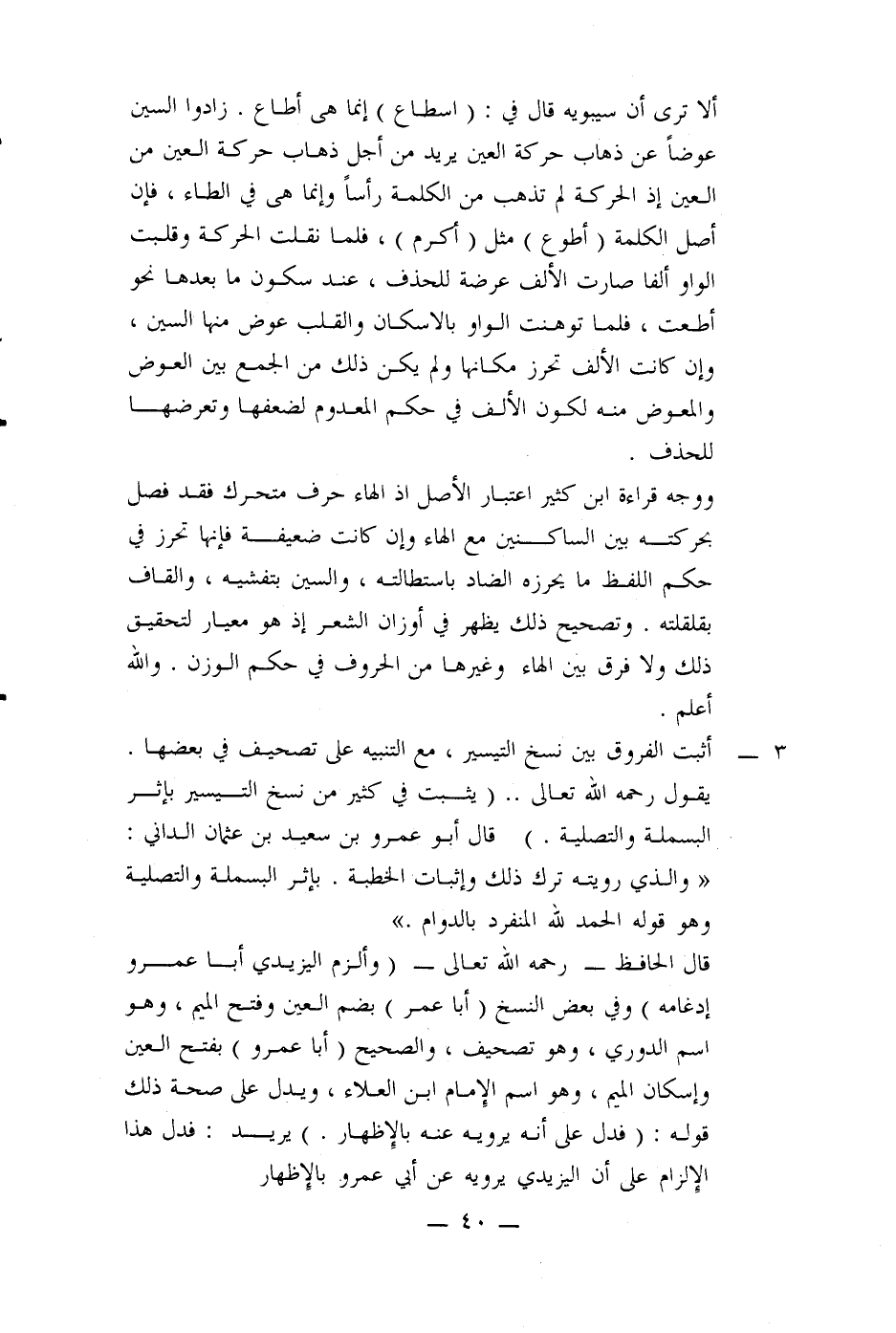 3 - أثبت الفروق بين نسخ التيسير، مع التنبيه على تصحيف في بعضها. يقول - رَحِمَهُ اللهُ تَعَالَى - .. (يثبت في كثير من نسخ التيسير بإثر البسملة والتصلية.) قال أبو عمرو بن سعيد بن عثمان الداني: "والذي رويته ترك ذلك وإثبات الخطبة. بإثر البسملة والتصلية وهو قوله الحمد لله المنفرد بالدوام."