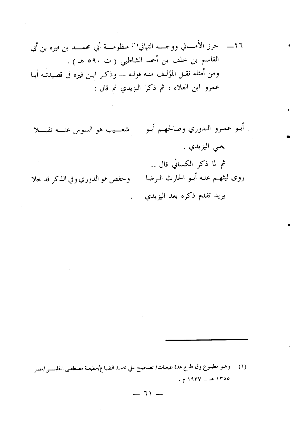 (¬1) وهو مطبوع وق طبع عدة طبعات / تصحيح على محمد الضباع / مطبعة مصطفى الحلبي / مصر 1355 هـ - 1937 م.
