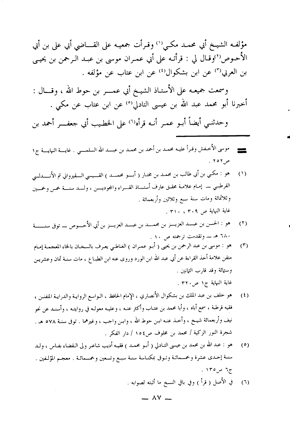 (¬1) هو: مكي بن أبي طالب بن محمد بن مختار (أبو محمد) القيسي القيرواني ثم الأندلسي القرطبي - إمام علامة محقق عارف أستاذ القراء والمجودين: ولد سنة خمس وخمسين وثلاثمائة ومات سنة سبع وثلاثين وأربعمائة.