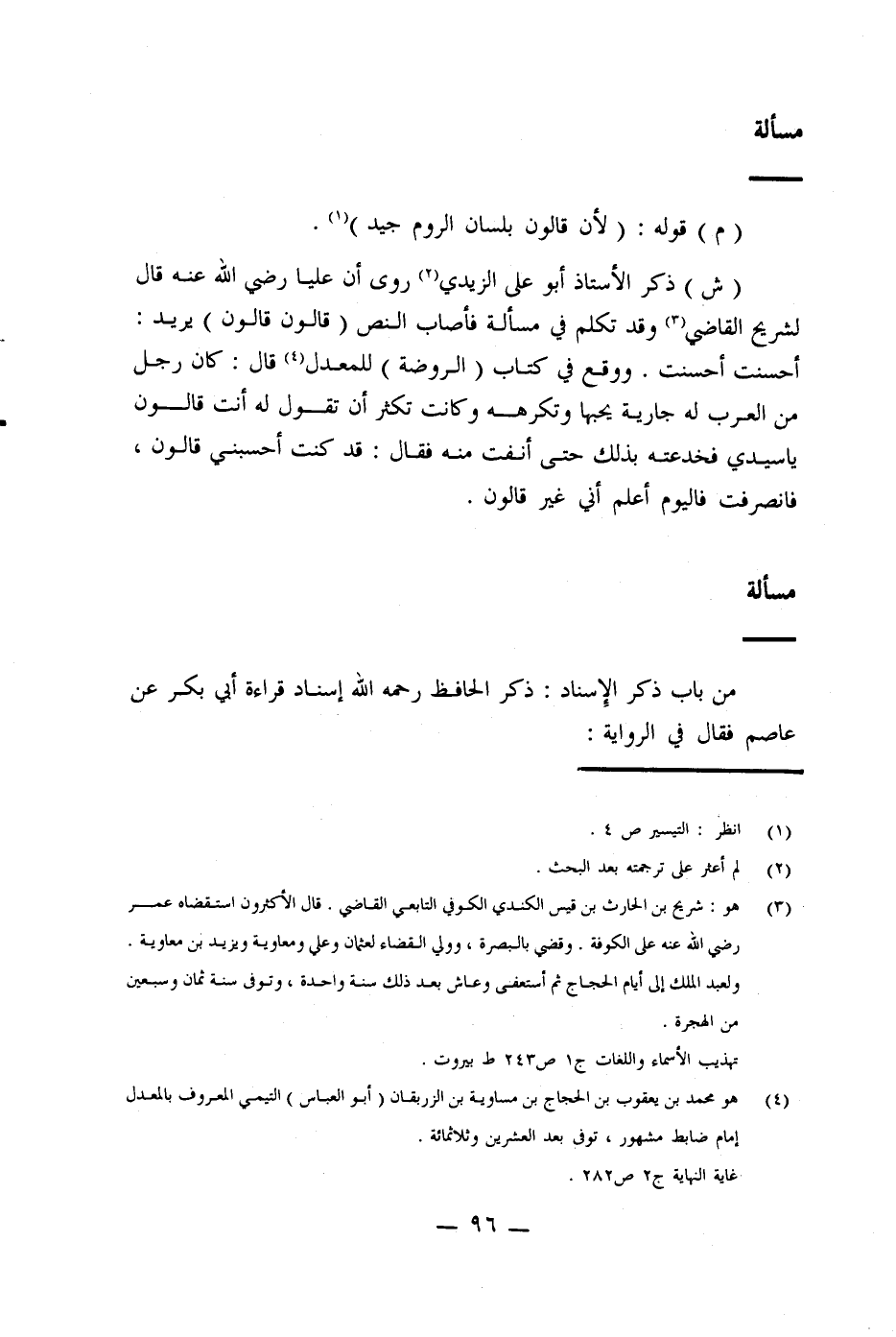 (¬3) هو: شريح بن الحارث بن قيس الكندي الكوفي التابعي القاضي. قال الأكثرون استقضاه عمر - رضي الله عنه - على الكوفة. وقضى بالبصرة، وولي القضاء لعثمان وعلي ومعاوية وفي يزيد بن معاوية.