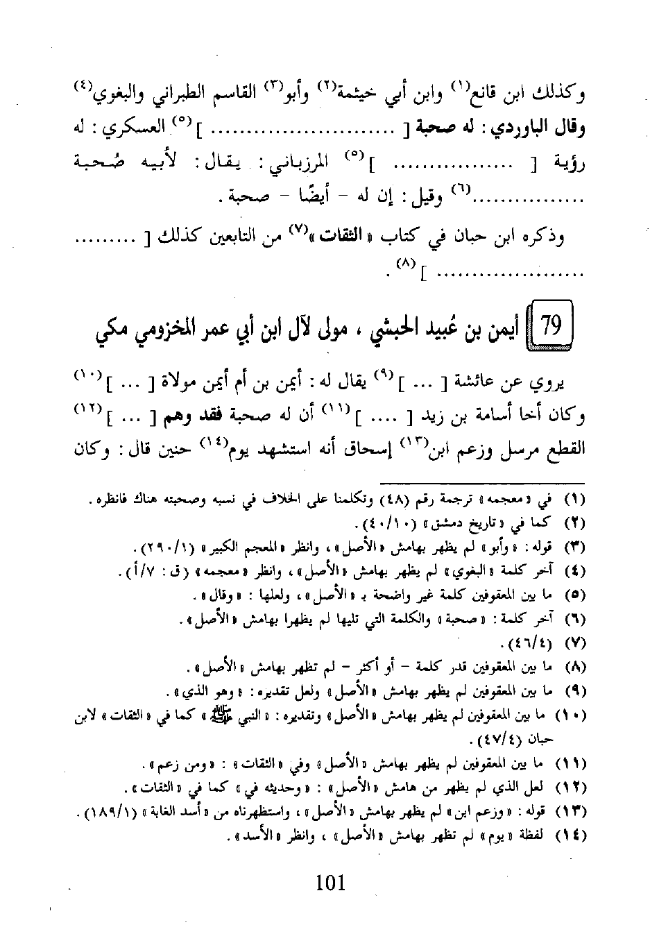 يروي عن عائشة [. . .] (٩) يقال له: أيمن بن أم أيمن مولاة [ ... ] (١٠) وكان أخا أسامة بن زيد [ ... ] (١١) أن له صحبة فقد وهم [ ... ] (١٢) القطع مرسل وزعم ابن (١٣) إسحاق أنه استشهد يوم (١٤) حنين قال: وكان