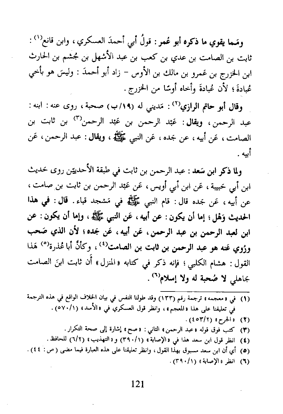 ولا ذكر ابن سَعد: عبد الرحمن بن ثابت في طبقة الأحديين روى حَديث ابن أبي حَبيبة، عَن ابن أبي أويس، عَن عَبْد الرحمن بن ثابت بن صامت، عن أبيه، عَن جَده قال: قام النبي - صلى الله عليه وسلم - في مَسْجد قباء. قال: في هذا الحديث وَهْل، إما أن يكون: عن أبيه، عَن النبي - صلى الله عليه وسلم -، وإما أن يكون: عن ابن لعبد الرحمن بن عبد الرحمن، عَن أبيه، عَن جَده؛ لأن الذي صَحب وروي عَنه هو عبد الرحمن بن ثابت بن الصامت (٤)، وكأن أبا عُذرة (٥) هَذا القول: هشام الكلبي؛ فإنه ذكر في كتابه "المنزل" أَن ثابت ابنَ الصامت جَاهلي لا صحبة له ولا إسلام (٦).