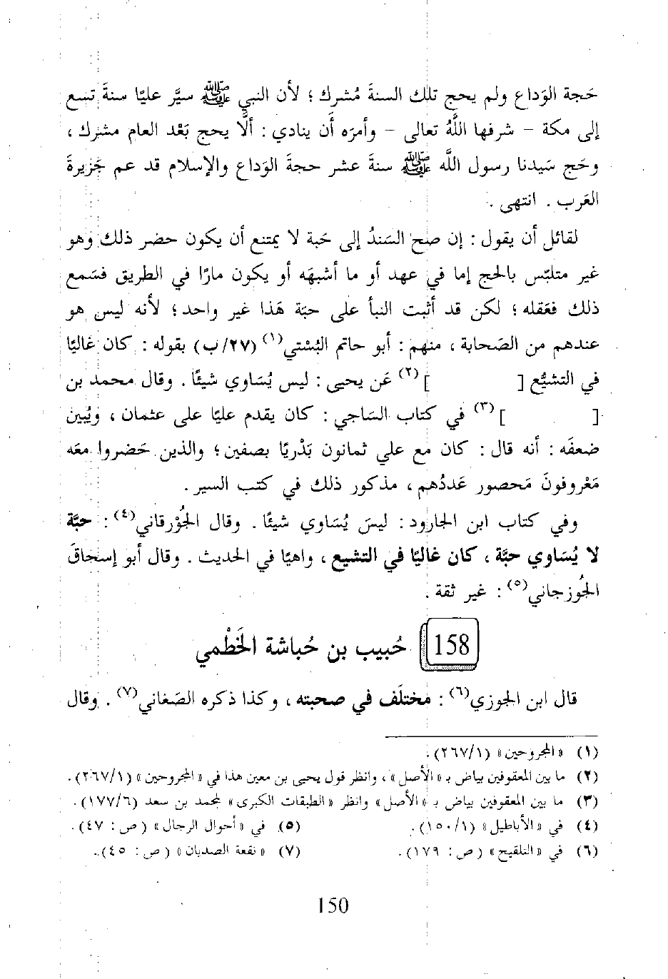 لقائل أن يقول: إن صح السَندُ إلى حَبة لا يمتنع أن يكون حضر ذلك وهو غير متلبّس بالحج إما في عهد أو ما أشبهَه أو يكون مارًا في الطريق فسَمع ذلك فعَقله؛ لكن قد أثبت النبأ على حبَة هَذا غير واحد؛ لأنه ليس هو عندهم من الصَّحابة، منهم: أبو حاتم البستي (١) بقوله: كان غاليًا في التشيُّع [] (٢) عَن يحيى: ليس يُسَاوي شيئًا. وقال محمَّد بن [] (٣) في كتاب السَاجي: كان يقدم عليًّا على عثمان، ويُبين ضعفَه: أنه قال: كان جمع علي ثمانون بَدْريًّا بصفين، والذين حَضروا معَه مَعْروفونَ مَحصور عَددُهم، مذكور ذلك في كتب السير.