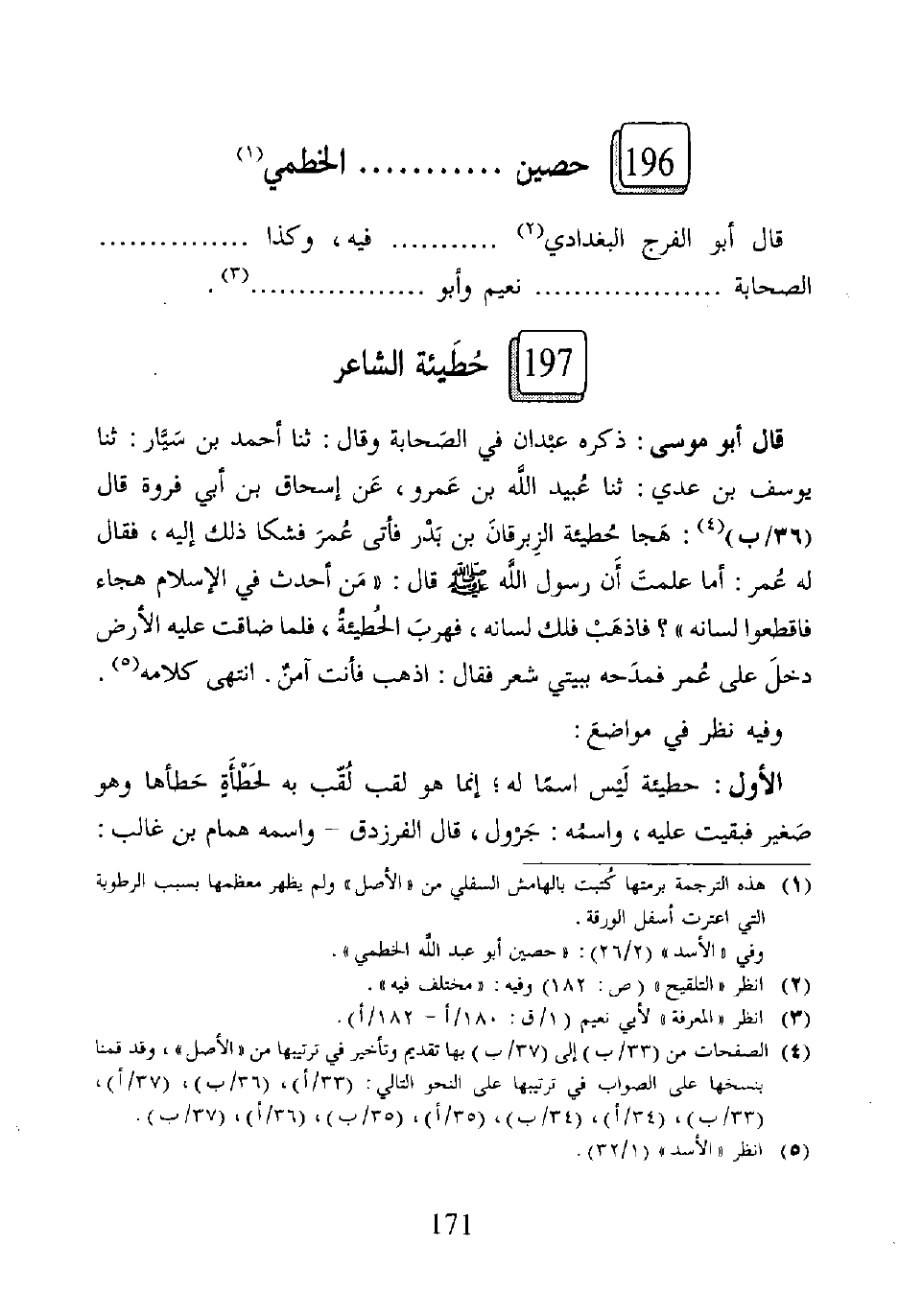 الأوّل: حطيئة لَيس اسمًا له؛ إنما هو لقب لُقّب به لحَطْأَةٍ؛ حَطأها وهو صَغير فبقيت عليه، واسمُه: جَرْول، قال الفرزدق -واسمه همام بن غالب: