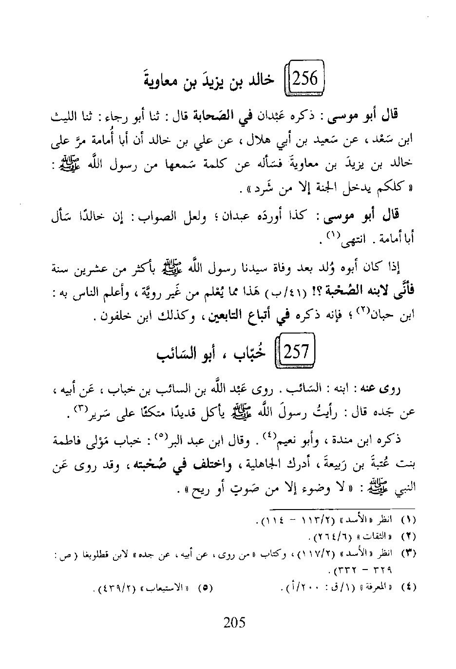 قال أبو موسى: ذكره عَبْدان في الصَّحابة قال: ثنا أبو رجاء: ثنا الليث بن سَعْد، عن سَعيد بن أبي هلال، عن علي بن خالد أن أبا أُمامة مرَّ على خالد بن يزيدَ بن معاويةَ فسَأله عن كلمة سَمعها من رسول الله - صلى الله عليه وسلم -: "كلكم يدخل الجنة إلا من شَرد".