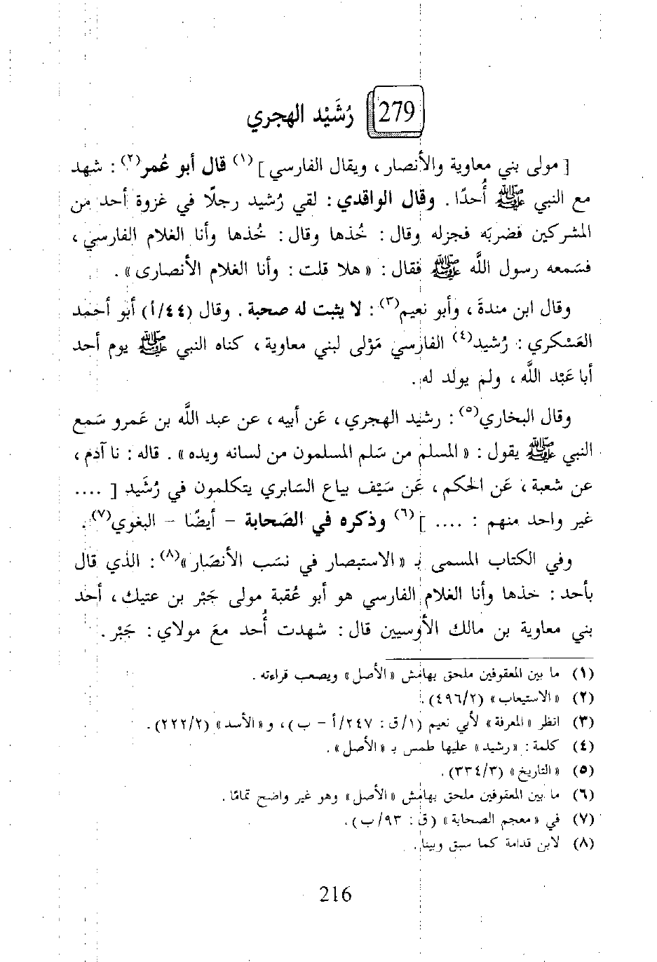 وقال البخاري (٥): رشيد الهجري، عَن أبيه، عن عبد الله بن عَمرو سَمع النبي - صلى الله عليه وسلم - يقول: "المسلم من سَلم المسلمون من لسانه ويده". قاله: نا آدم، عن شعبة، عَن الحكم، عَن سَيف بياع السَابري يتكلمون في رُشَيد [ .... غير واحد منهم: .... ] (٦) وذكره في الصحابة -أيضًا- البغوي (٧).