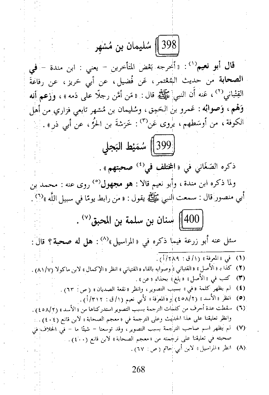 (٧) لم يظهر اسم صاحب الترجمة بسبب التصوير، وقد توسعنا - شيئًا ما - في الخلاف فِي صحبته فِي تعليقنا على ترجمته من "معجم الصحابة" لابن قانع (٤٠٠).